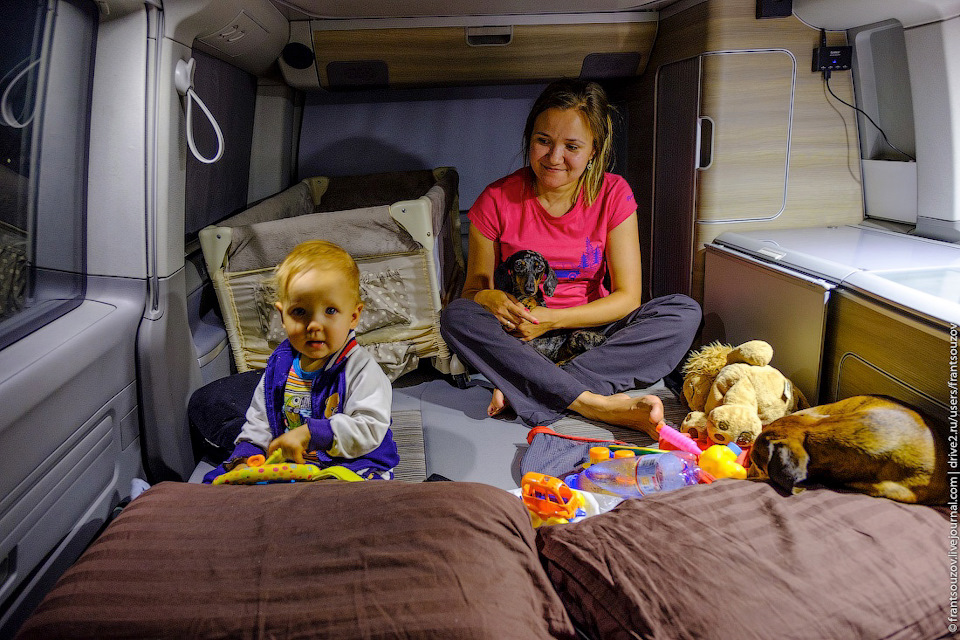 В первый раз с ночёвкой в машине — ему ещё 9 месяцев не исполнилось. Хотели раньше в Карелию поехать, но не получалось. А так на работу его начали с собой возить на седьмой день после рождения, жена у меня фактически без декрета была. :)