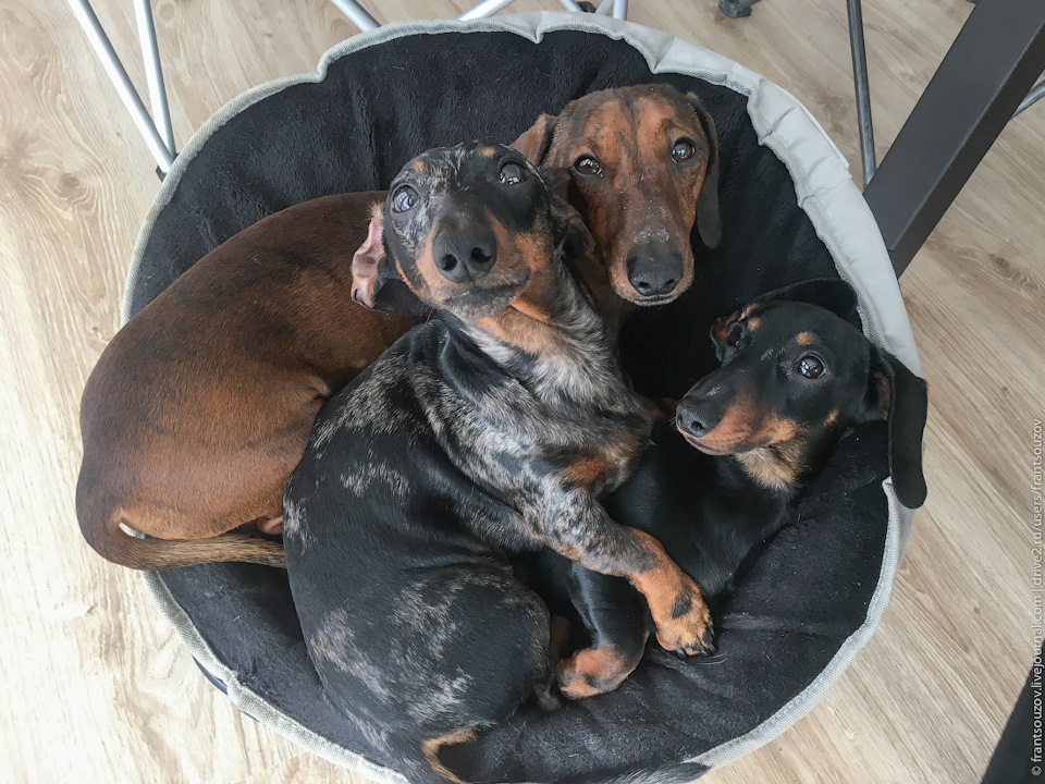 4. В марте к нам в гости на пару недель приезжал Макарка, сын Звездульки. На фото он справа. Три таксы в доме — это с одной стороны очень здорово, а с другой — это чересчур… Юля очень хотела его оставить, он просто нереально ласковый и умный, но после окончания передержки всё же пришлось возвращать его заводчику. :(