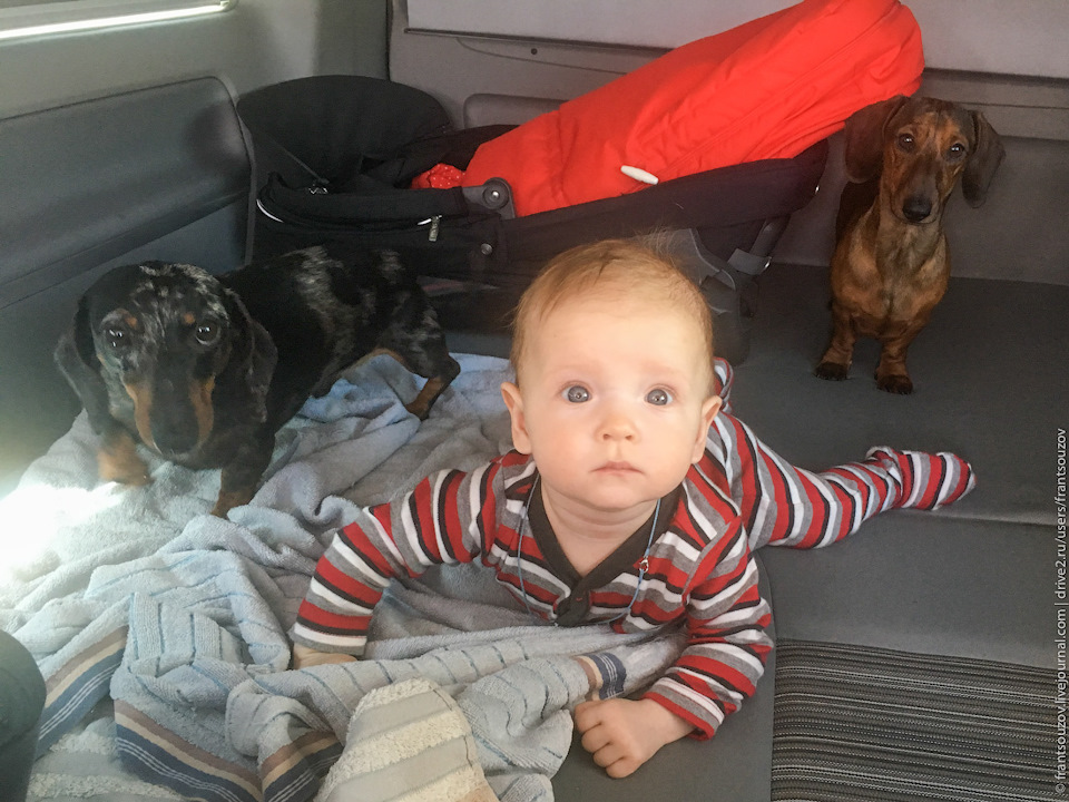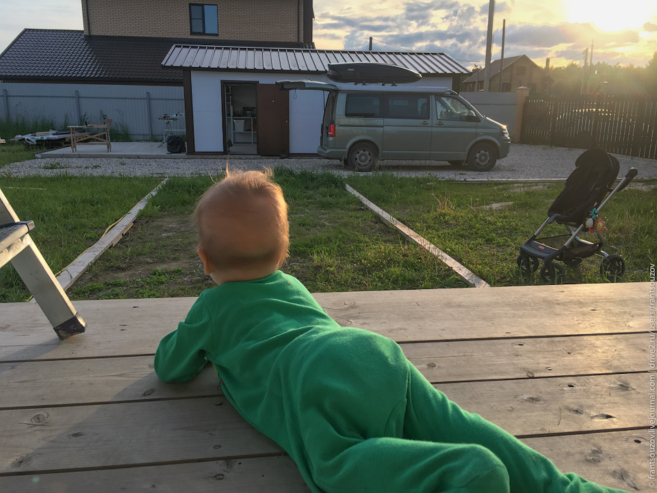 15. В августе мы поняли, что уже изрядно засиделись дома. После чего собрали в дорогу кемпер и отправились на Кавказ. По дороге выяснилось, что у нас отказал полный привод из-за поломки насоса муфты Халдекс. Пока машина была в воронежском сервисе на диагностике, в зоне ожидания Виктор внезапно пополз на четвереньках.