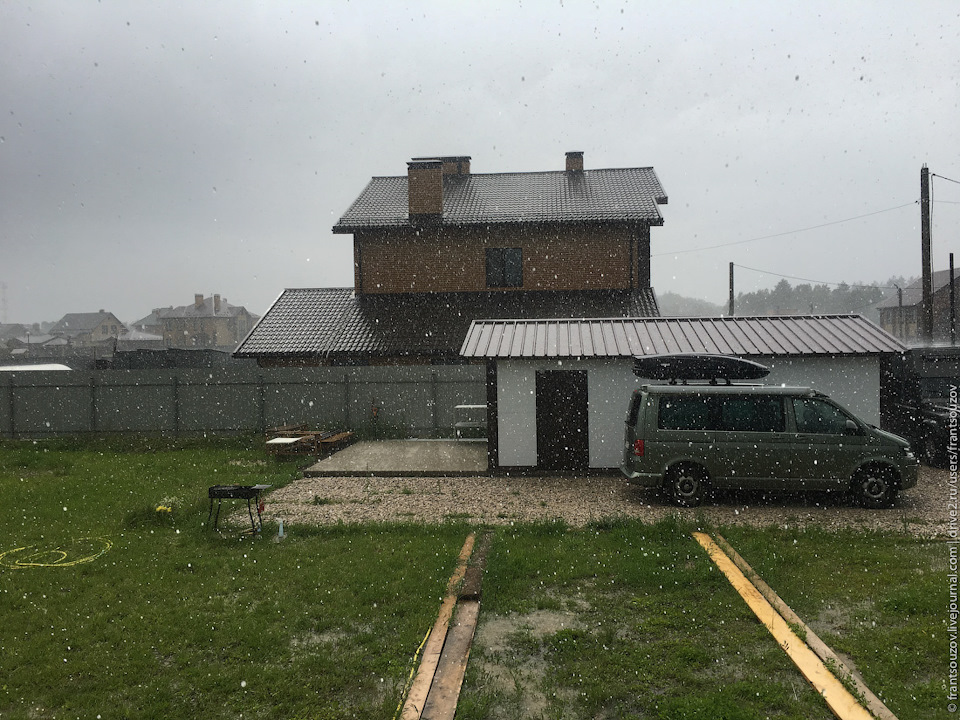 13. Тем временем, дома было не лучше. Ливни, град, гроза. Участок, несмотря на ливневую траншею вокруг, все равно частично подтапливало. И надо будет в следующем году обязательно устанавливать громоотвод: пару раз уже видел, как молнии били вон по тому леску справа. Я обычно к грозе нормально отношусь, но когда это происходит совсем рядом, становится страшновато.