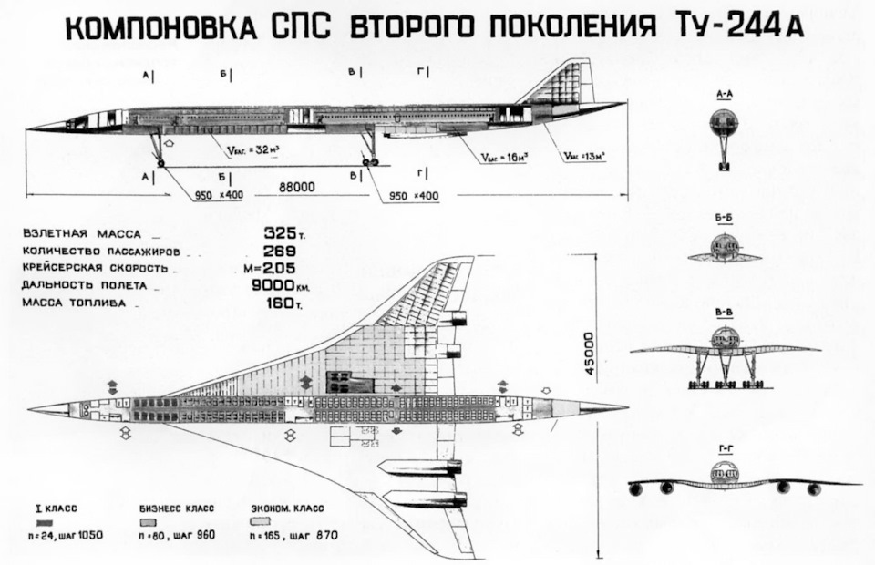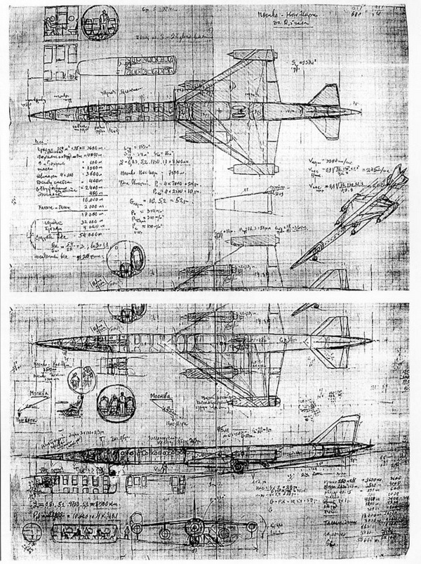 В дальнейшем скорость поднимется до 3000—3500 км/ч и соответственно дальность будет увеличена до 8000 км. Сверхзвуковые пассажирские самолеты первого этапа должны совершать полеты на высотах 14—17 км». (РГАЭ, ф.2597, оп.1, д.2622.)