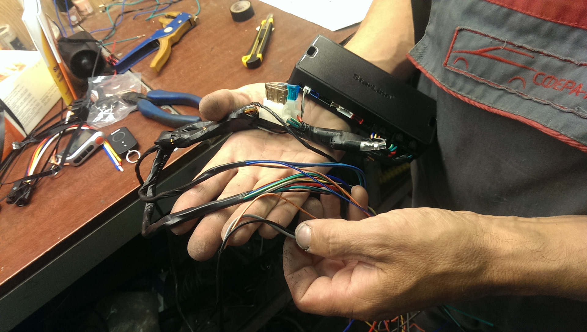 Плету косу проводов на сигнализацию. Как выглядит готовая проводка для подключения сигнализации (коса). Один отдельный провод для ручного тормоза, который идет к щитку приборов. Сам блок сигнализации Starline A63 я буду также устанавливать за щитком приборов. От блока идет 3 маленькие косы. Одна идет под капот: на сирену и концевик капота. Вторая расходится и основной жгут уходит на питание, зажигание, блокировку, повороты и концевик двери. Оставшийся жгут уходит на центральный замок, концевик багажника и концевики дверей. Оставшиеся провода я примотал к жгуту.