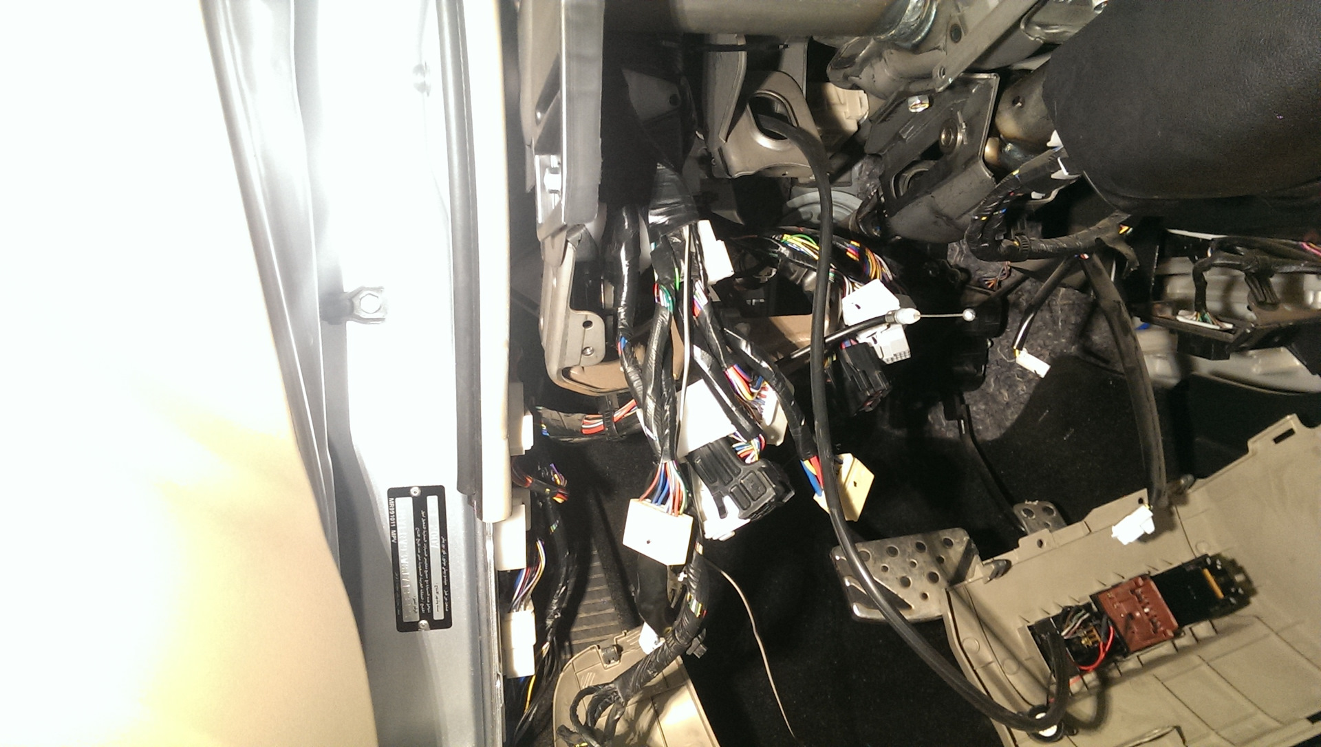 Блок сигнализации Starline A63 установил за прибороной панелью, приклеив на двухсторонний скотч и закрепив пластиковой стяжкой. Провода пустил вниз под воздуховодами, пускаем жгуты так, как обговаривалось ранее. Также блокируем и прячем реле.