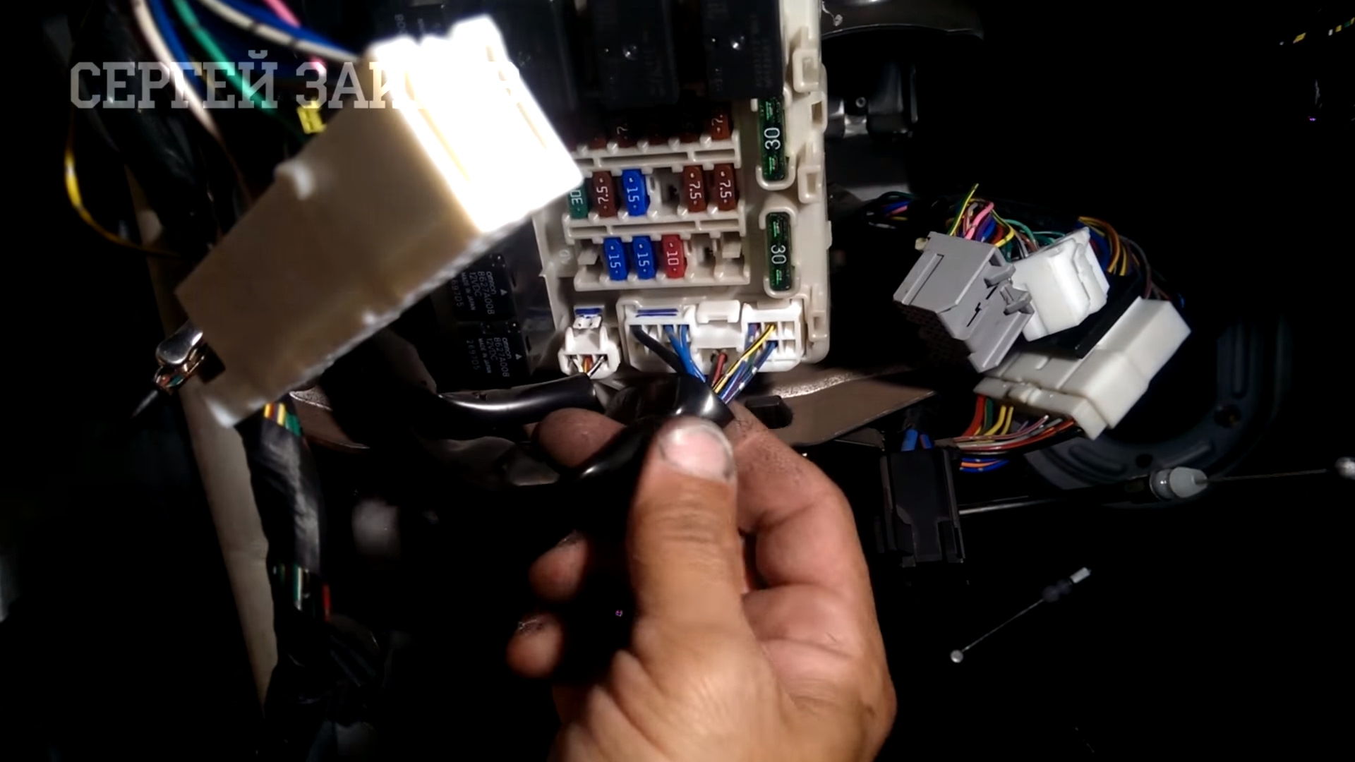Определяемся с проводами для подключения сигнализации. С верхнего разъема с блока предохранителей беру плюс — толстый синий провод и зажигание — толстый синий провод с черной полосой. На следующем разъеме, который находится немного ниже, подключаю повороты — зеленый с красной полосой и зеленый с желтой полосой. Со следующего широкого белого разъема использую розовый — концевик задней левой двери, желтый с черной полосой — блокировка двигателя. С торца блока предохранителя находим 2 разъема, серый и белый. На сером разъеме используем желтый провод с розовой полоской — концевик задней правой двери, желтый провод с зеленой полосой — концевик передней правой двери. На белом разъеме нам нужны коричневый провод с черной полосой — центральный замок "открыть", салатовый с красной полосой — центральный замок "закрыть", черный с синей полосой — концевик багажника. И еще на нижнем широком разъеме берем желтый провод с черной полосой — концевик водительской двери. Массу буду брать в сапоге на клеммнике. Стоп сигнал на белом разъеме — синий с оранжевой полосой. Ручник подключаем на щитке приборов — левый разъем, желтый провод с черной полосой. Также установим концевик капота и сирену.
