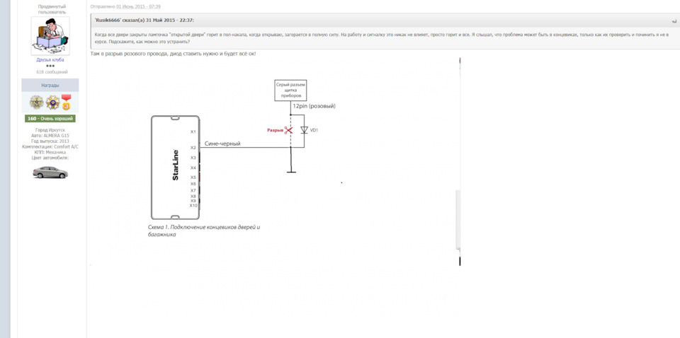 Приветствую, подскажите по непонятному моменту. Установили сигнализацию starline a63. Горит индикатор открытой двери на приборке в пол накала, при открытии горит ярко как надо, после закрытия опять в пол накала. Нужно диод впаивать?