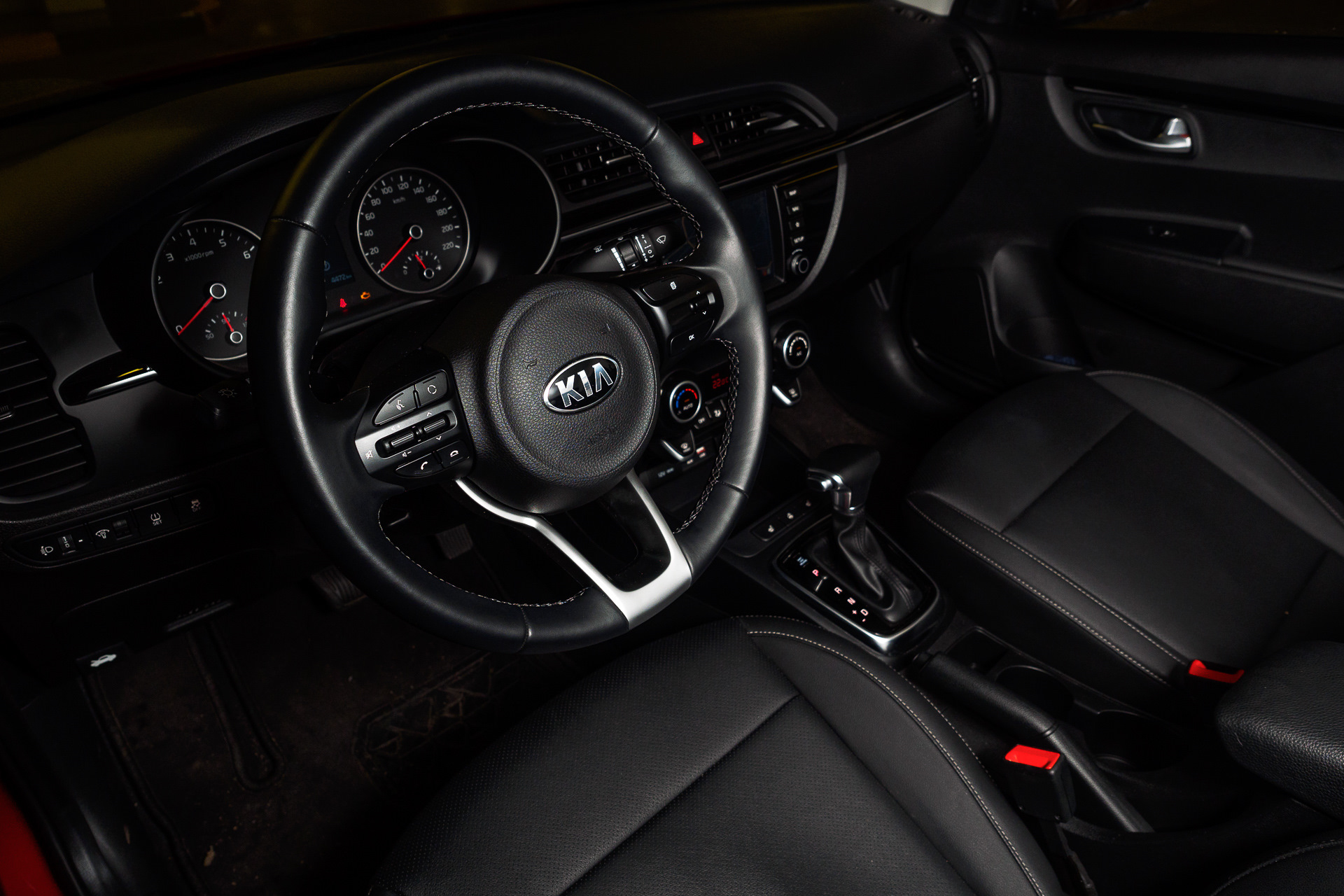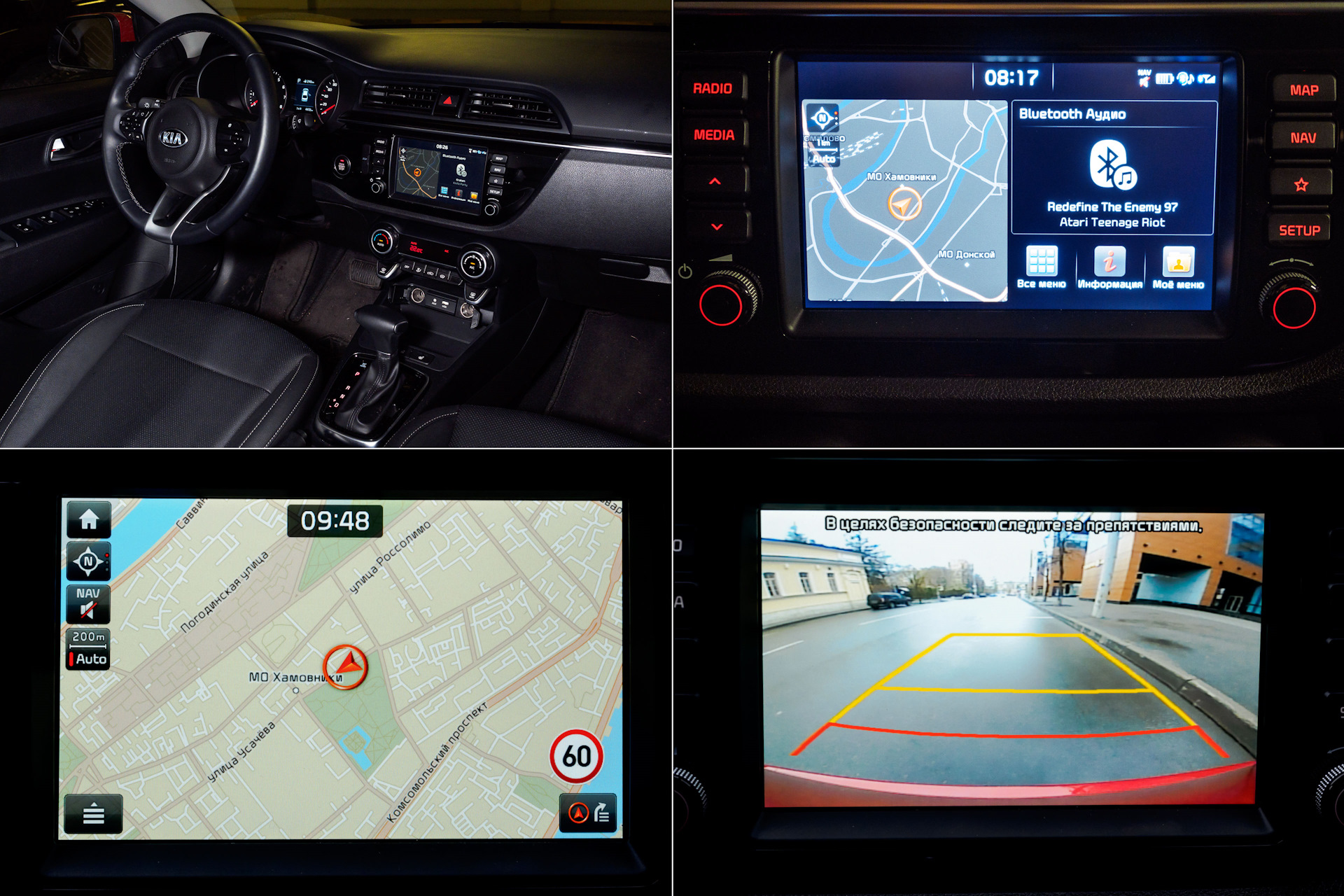 Кресла умеренно-бесформенные, похуже, чем у Rapid. Спереди чуть-чуть просторнее, чем в старом Rio, а главное, новый кореец предлагает широкий спектр оснащения. В тестовой “топовой” машине есть шторки безопасности, приличная магнитола с 7-дюймовым экраном, навигацией с пробками, поддержкой Apple Car Play и Android Auto и камерой заднего вида, “эко-кожаная” обивка сидений, бесключевой доступ, обогрев форсунок, лобового стекла, руля и задних сидений и многое другое.