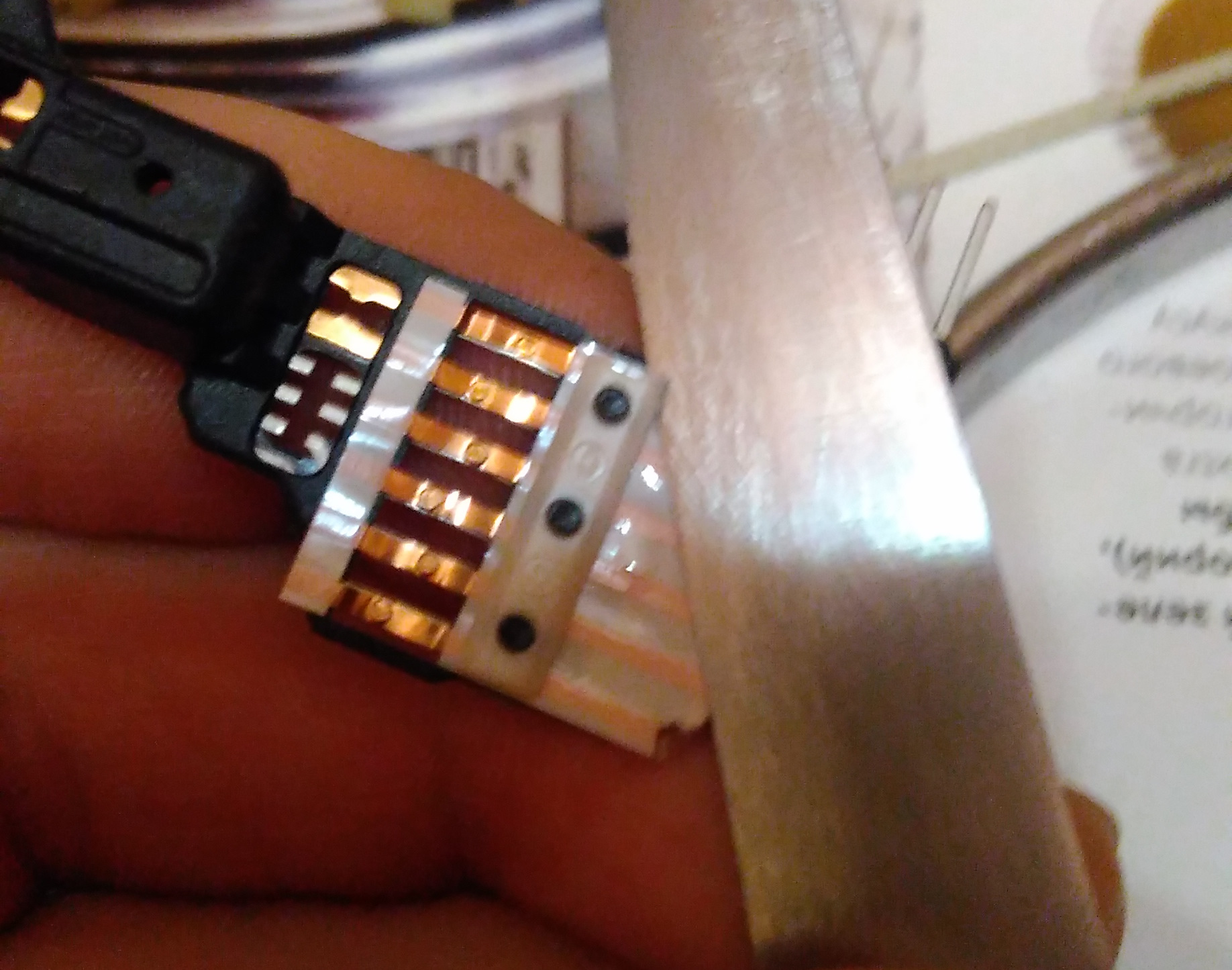Надеваем шлейф на шпыньки и пропаиваем. Здесь главное не перевернуть шлейф. Для этого прикладываем разъем и шлейф к блоку, чтобы понять их взаимное расположение.