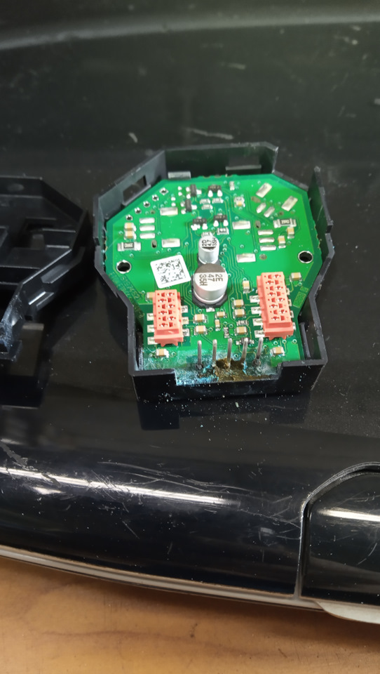 Облуживаем с обоих сторон. Далее – ответная часть. Аккуратно поддеваем фиксирующую накладку ножом и греем термофеном черные «шпыньки» которые ее держат.