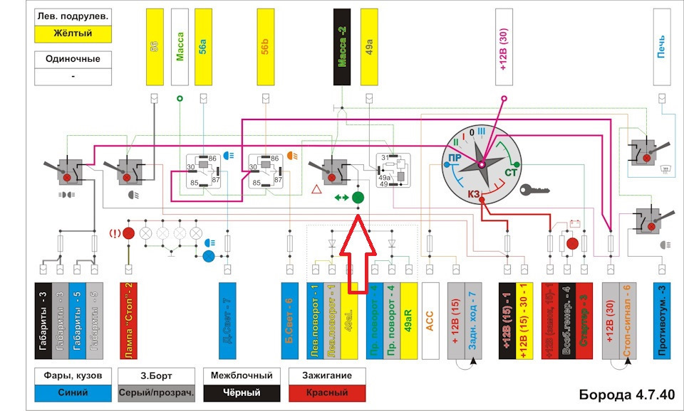 Минус через нить? Но ведь если поворот не включен, 49а не идет ни через одну нить. И я в стандартных схемах не помню, чтобы поворотники работали без зажигания. Только аварийка…