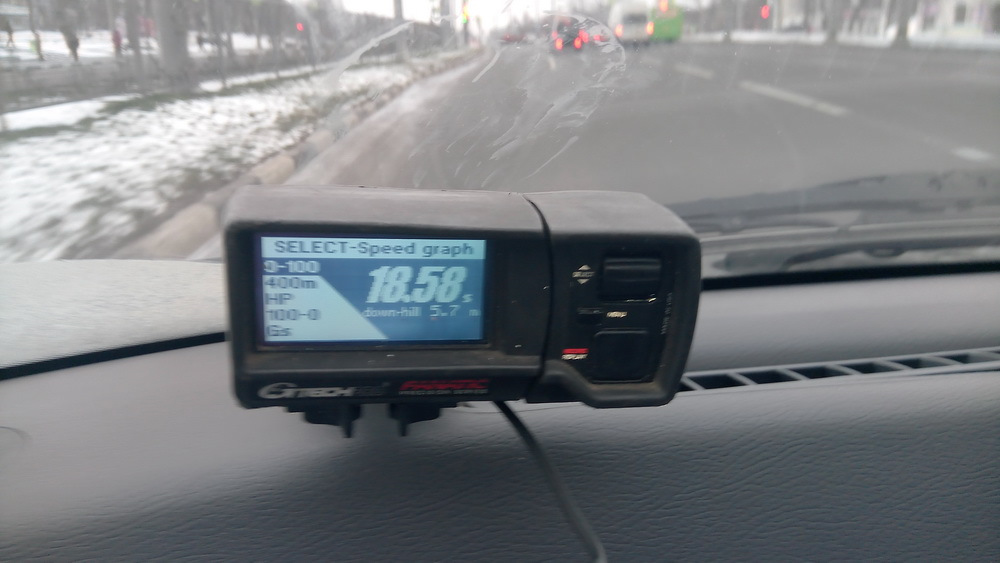 Далее делаем замер на пресловутой прошивке, вдвоем с пассажиром. Машина на прошивке с трудом показывает время 21,5 секунда сотня по GPS.Особенно сильный дисбаланс заметен на 3 и 4 передачах, машина кажется вообще не ускоряется.