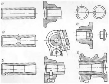 Поршневые пальцы двухтактных двигателей с торцов закрываются иногда заглушками, предотвращающими в этом случае возможное перетекание газов между впускными и выпускными окнами. На двухтактных дизелях ЯМЗ пальцы с торцов закрываются стальными заглушками. От осевого перемещения пальцы в этих двигателях фиксируются стопорными кольцами, показанными на рис. д.
