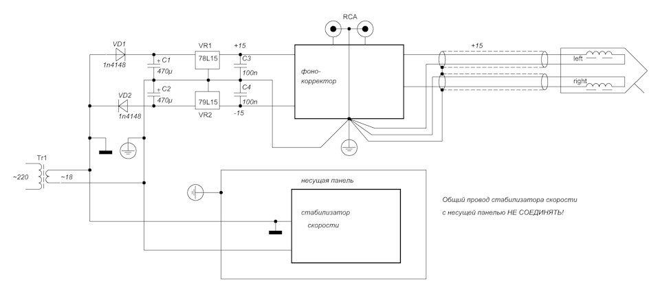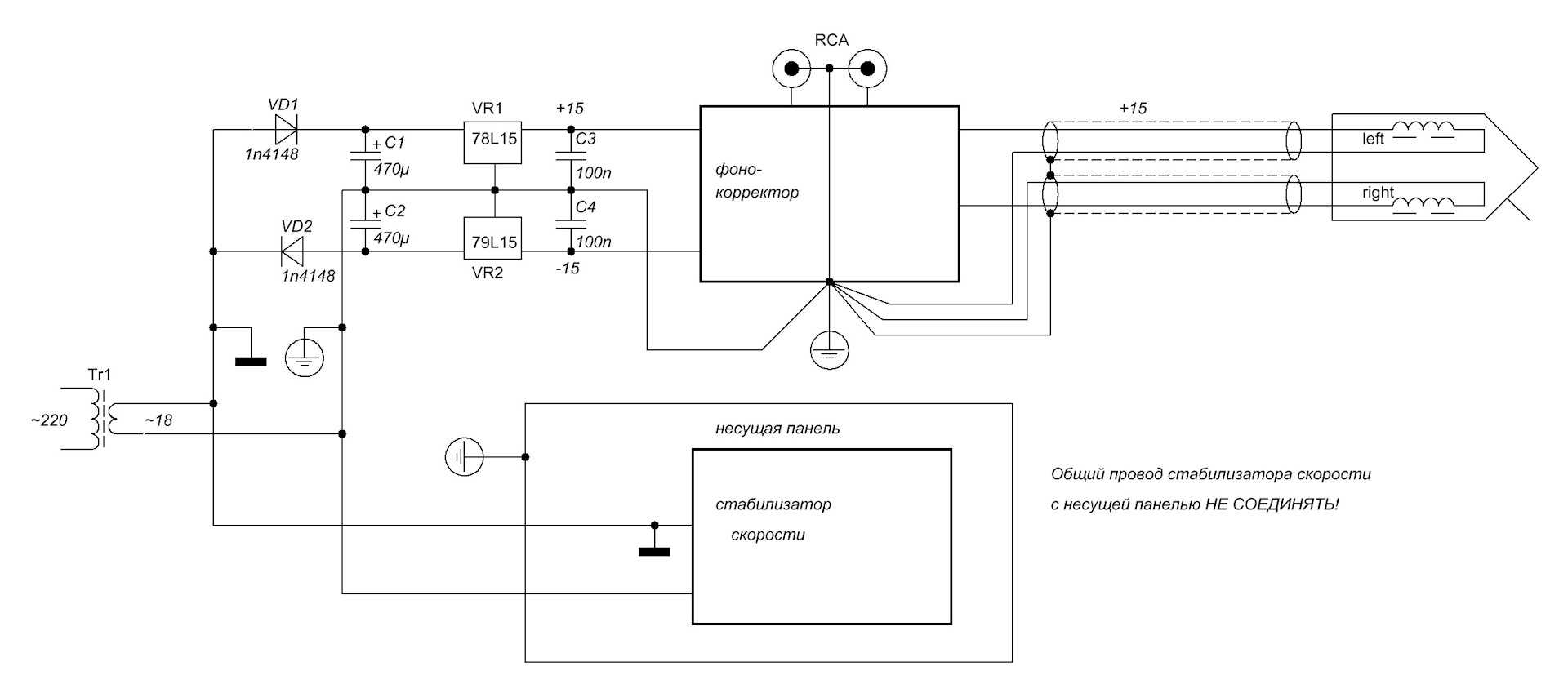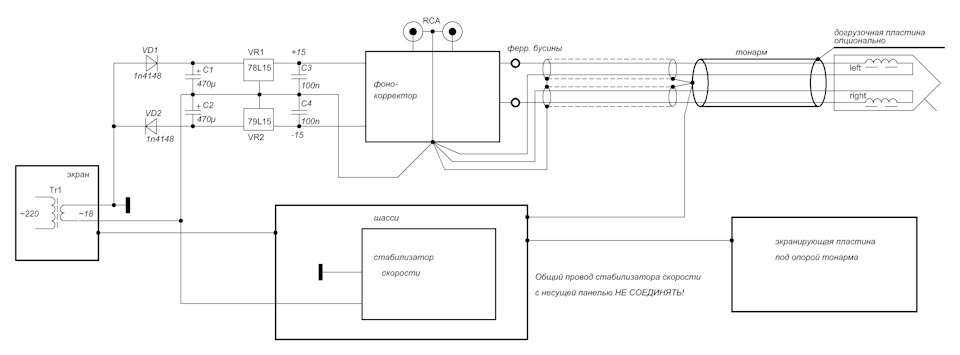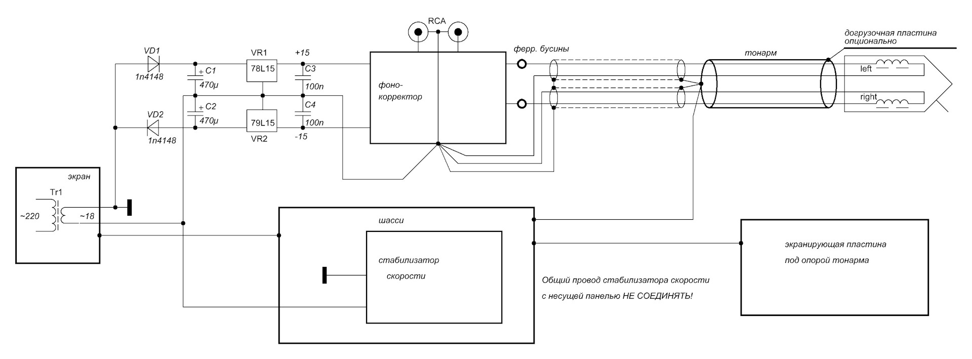 Схему прилагаю. Обратите внимание- голову я подключил максимально по-феншую, двухпроводным кабелем в экране. Кроме того- это важно! — общий провод корректора и головы соединен с несущей панелью, общий провод стабилизатора скорости от нее оторван! Если их объединить- получим дополнительную наводку при работе двигателя, а в таком варианте он никак не проявляется.