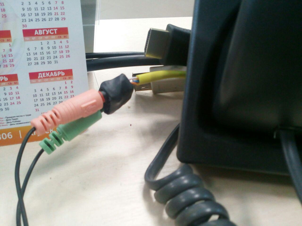 Гарнитура со штекером rj9 у меня, а подключить ее нужно в звуковую карту компа. Jack 3.5 для микрофона и такой же для наушников.