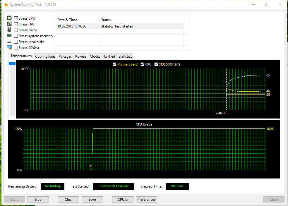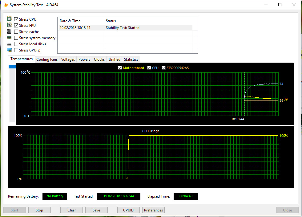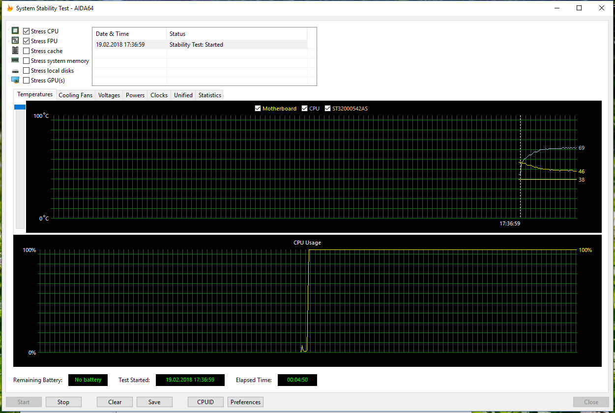 И смотрим на боксовый кулер в стандартном тесте АИДА. Да этот тест греет процессор не так сильно как linX, однако куда сильнее, чем игры или другие повседневные задачи, на linX с боксом — не решился.