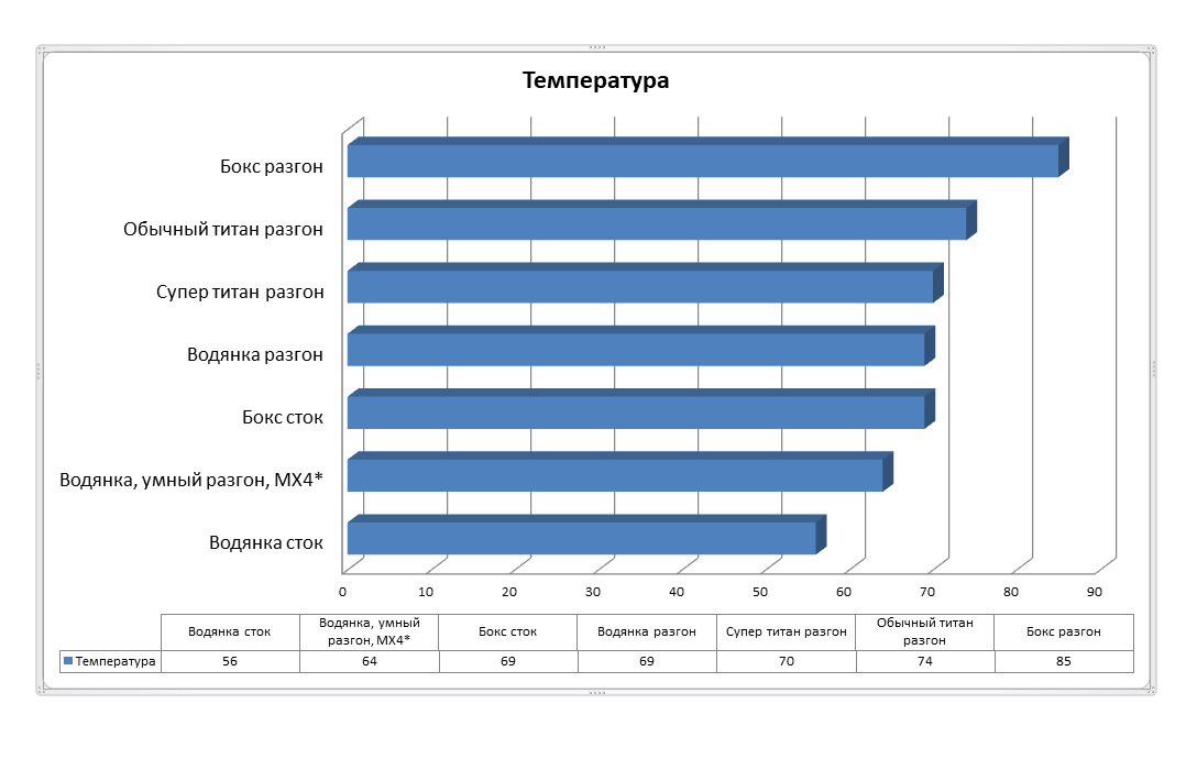И для начала эффективность боксового кулера, без разгона. Почему тесты проходили так мало, а не часами? Хватит и этого.