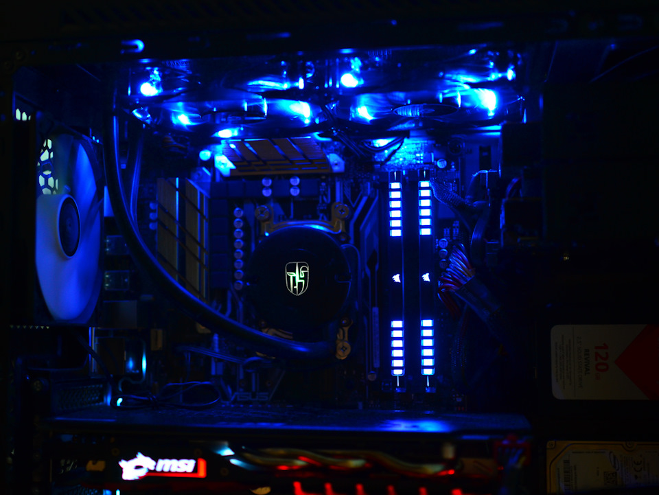 Как видно по цифрам — СВО вне конкуренции. Конечно, если корпус позволяет, можно купить супербашню, по эффективности и цене это аналогично такой не дорогой «воде». Да еще есть и плюсы в гораздо большей надежности. Но я выбрал «воду» прежде всего из-за красоты и удобства. Пара светящихся вертушек, открытая и доступная материнка, легкое обслуживание – чистка радиатора. Если же сравнивать с тем, что я упоминал выше, то вода дает возможность разогнать процессор и дальше. Боксовый кулер при этом явно не справляется. СВО в «правильном» разгоне до 3.7 с подобранным напряжением, качественной термопастой MX4 дает температуру 69 градусов в linX, при этом не выше 64 в АИДА. Это лучшый результат, чем бокс в своем номинале. Температура 85+ это никуда не годится. Титан конечно позволяет гонять на высоких частотах и в состоянии рассеять заявленные 130 ватт, но шум, даже на родном 2600 оборотов это уже громко. А с прокаченным 4300 – просто пылесос! Сидеть рядом крайне не комфортно! Ну а вода, в пике нагрузки в синтетике разгоняет две своих крутилки до 1800 оборотов, это чуть выше по шуму, чем шум фоновый шум от рабочего ПК. Если же брать реальные задачи, то получаем 600 оборотов — которые не слышно. И в играх до 1200, обычный легкий фоновый шум. И того, водянка, хоть и не дорогая, дает более низкую температуру, меньший шум и не занимает много места в корпусе. Конечно всегда есть риск протечки или выхода из строя помпы.