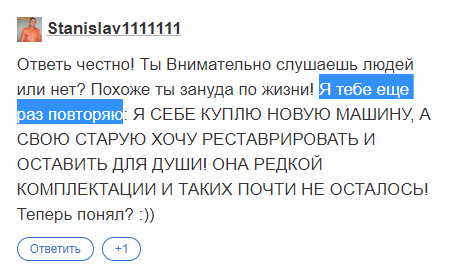 Ответь честно! Ты Внимательно слушаешь людей или нет? Похоже ты зануда по жизни! Я тебе еще раз повторяю: Я СЕБЕ КУПЛЮ НОВУЮ МАШИНУ, А СВОЮ СТАРУЮ ХОЧУ РЕСТАВРИРОВАТЬ И ОСТАВИТЬ ДЛЯ ДУШИ! ОНА РЕДКОЙ КОМПЛЕКТАЦИИ И ТАКИХ ПОЧТИ НЕ ОСТАЛОСЬ! Теперь понял? :))