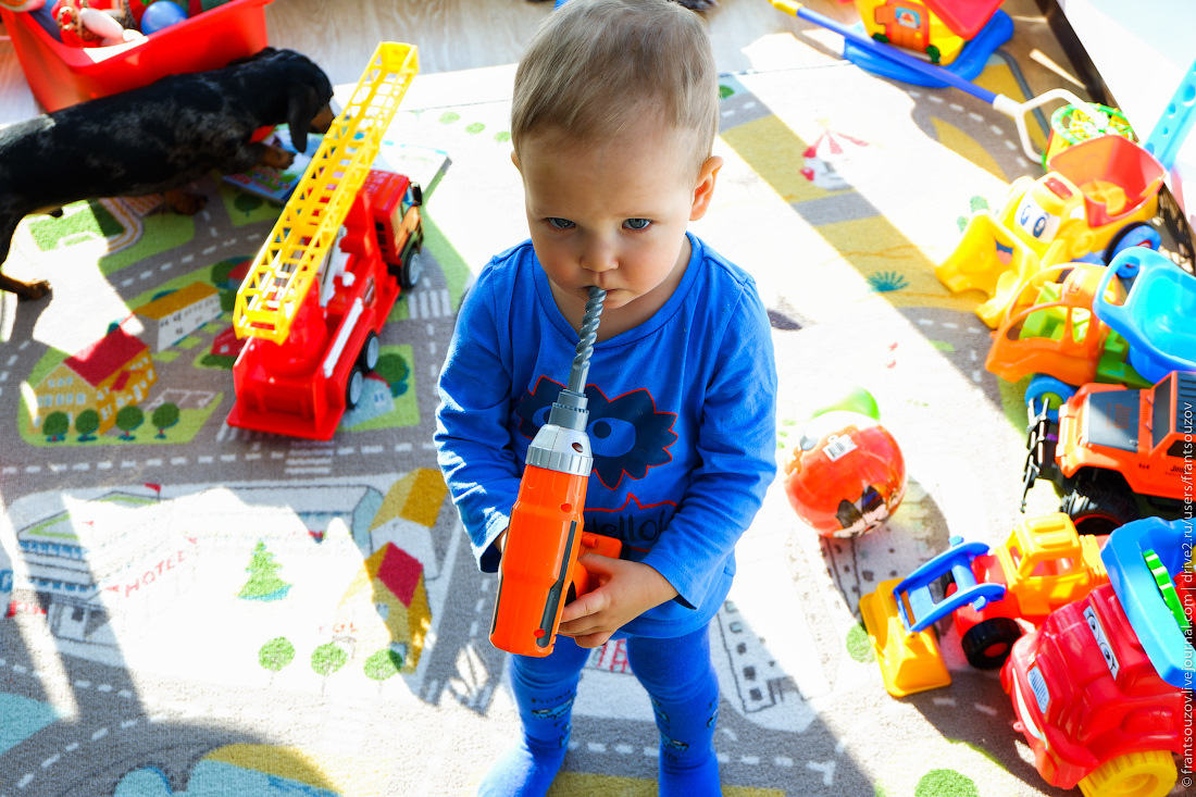 14. Виктор Денисович. В первую зиму мы было переживали, что через год на полу ему будет холодно, и он будет простужаться. По факту ему не до этого: ведь надо, к примеру, освоить скоростной спуск по лестнице, попробовать продегустировать какую-нибудь моющую химию, отобрать еду у собак, почесать режущиеся зубы шуруповёртом — в общем, дел более чем хватает, на простуду отвлекаться нельзя (тьфу-тьфу).