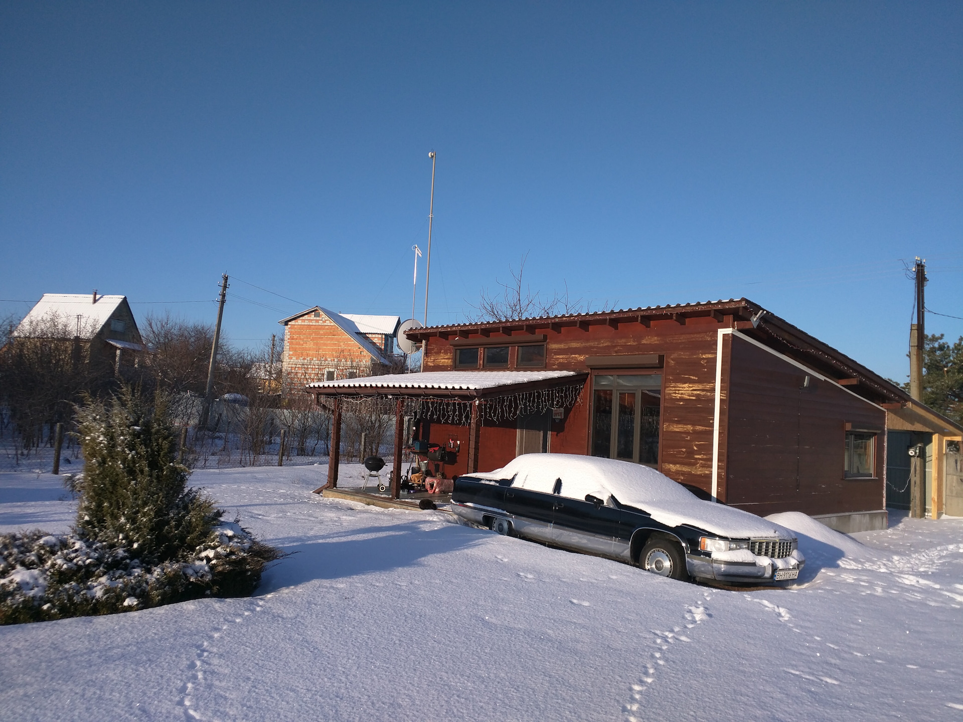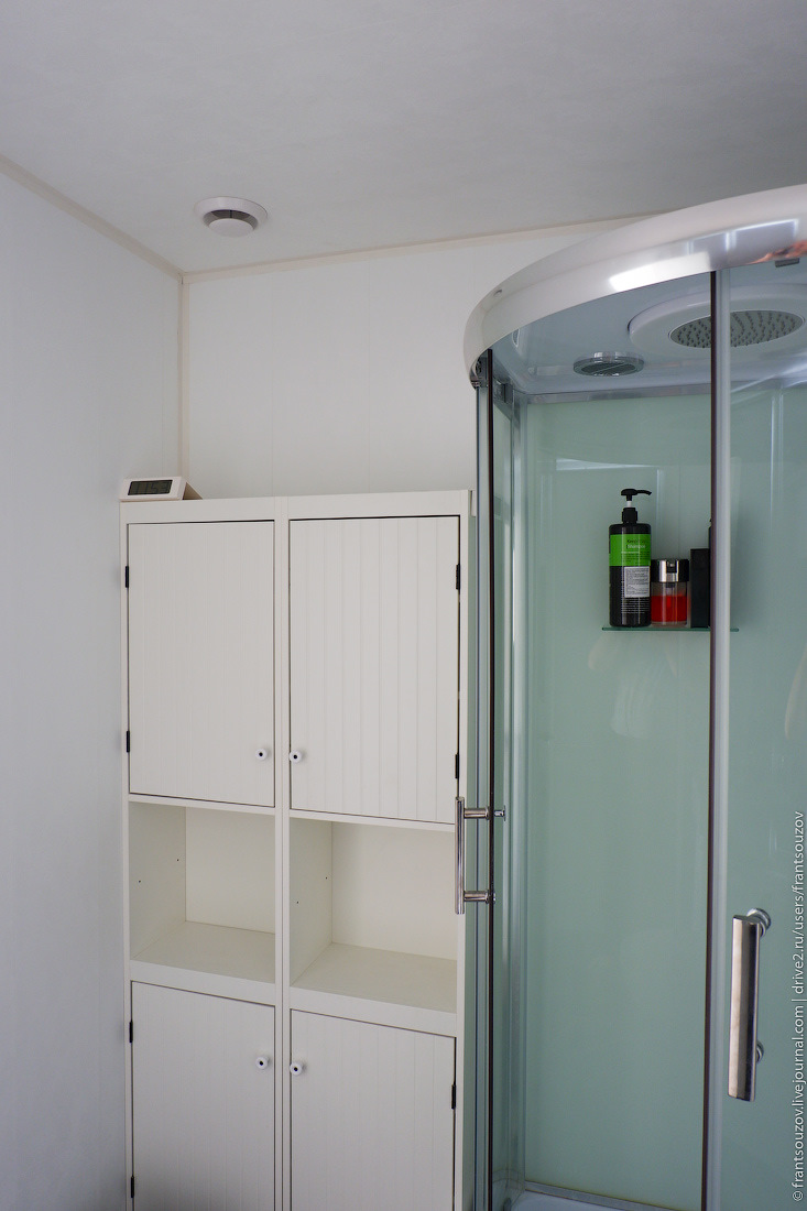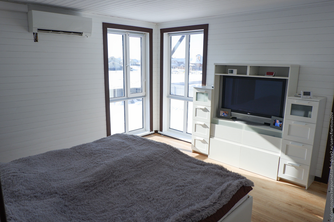 При отключении электричества дом остывает довольно быстро, примерно по градусу в час. Всё-таки как ни крути, а это каркасних, тем более, с большой площадью остекления. Зато и прогревается он очень быстро, тем более, что у кондиционеров есть режим повышенной мощности. Как запасной вариант на случай ЧП, под окнами стоит кемпер с "вебастой" и баком зимней солярки, в случае чего, переночевать несколько дней можно в нём.