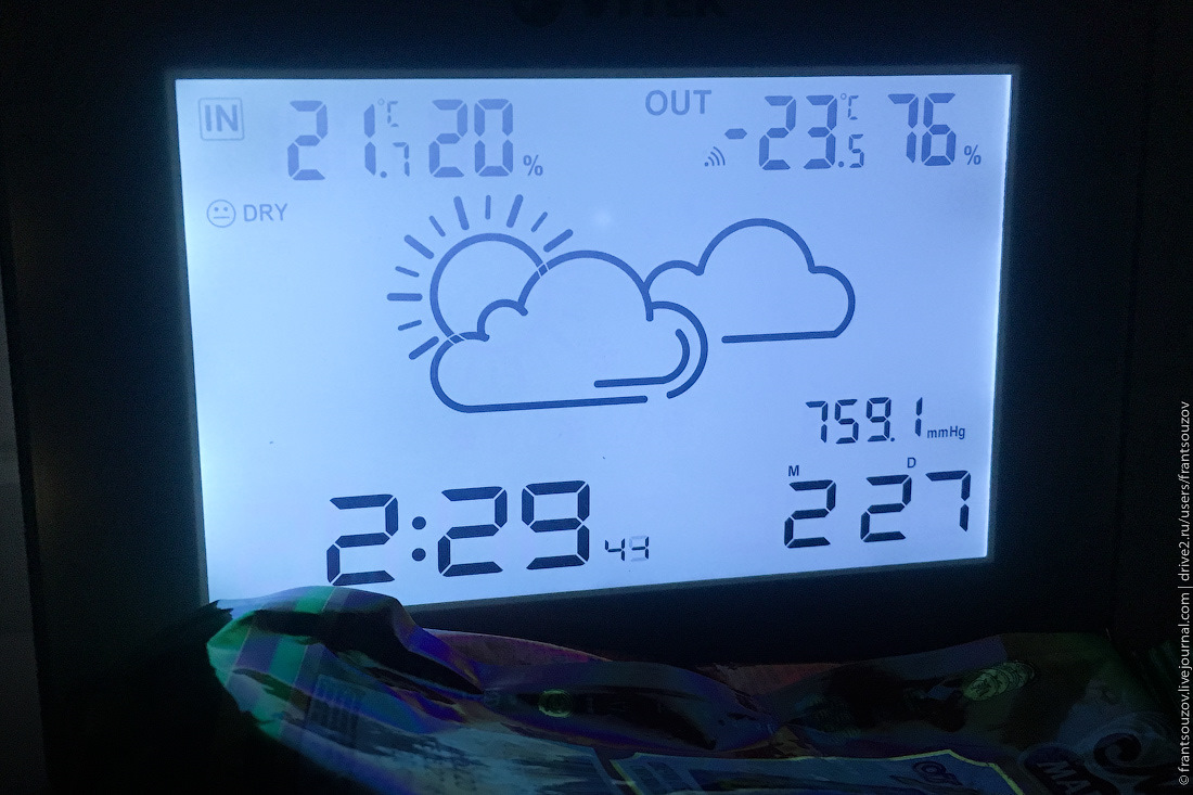 8. Перейдём к цифрам, всем ведь интересны именно они. Сегодня ночью бортовой компьютер машины, когда парковал её на площадке, показыват -26 градусов. Метеостанция показывала -23.5, но её уличный датчик зимой врёт ровно на один градус, так что истина где-то посередине — было примерно -25, а это как раз "паспортный" предел работы наших кондиционеров. В середине зала при этом комфортные 22 градуса тепла. Ради эксперимента выставляю на кондиционере максимальную температуру в 30 градусов и наиболее интенсивный режим работы вентилятора.