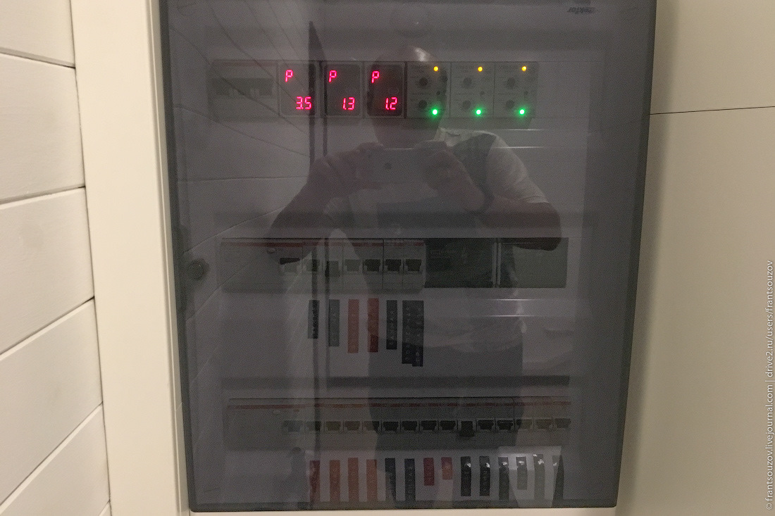 6. Да просто на момент переезда у нас была подключена только одна фаза из трёх, а следовательно — доступно лишь 5кВт из положенных на дом 15-ти. И этой самой доступной мощности нам впритык хватало на отопление 160 квадратных метров. Вот наш "щиток", выполненный по всем нормам ПУЭ.