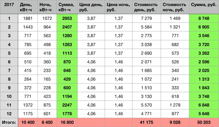 Итого: 50 200 рублей за год потрачено на электричество. Делим на 12 месяцев. Получается 4180 рублей в месяц в среднем.