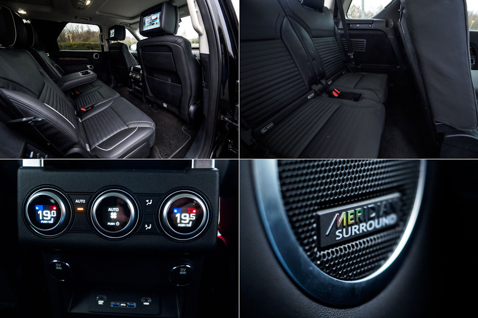 По сравнению с Discovery 4, второй ряд сидений стал просторнее и комфортнее. Раздельный климат, розетки USB и 220В, индивидуальные дисплеи с хорошим разрешением, индивидуальные же разъемы HDMI — все серьезно. Беспроводные наушники звучат лишь немногом хуже прекрасной головной аудиосистемы Meridian.
