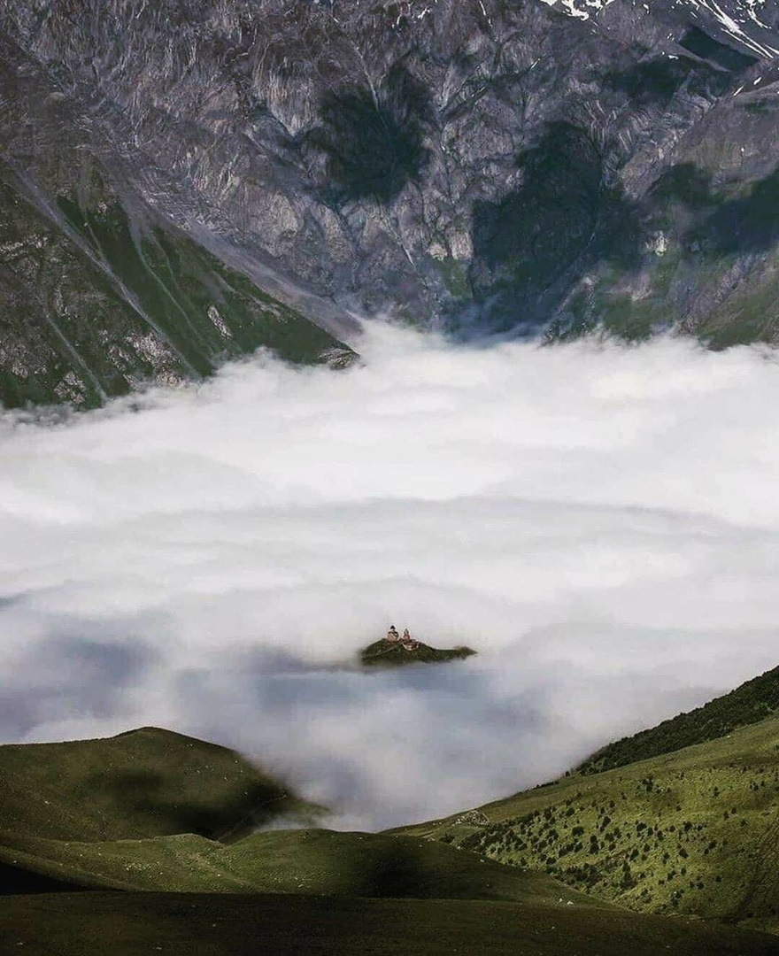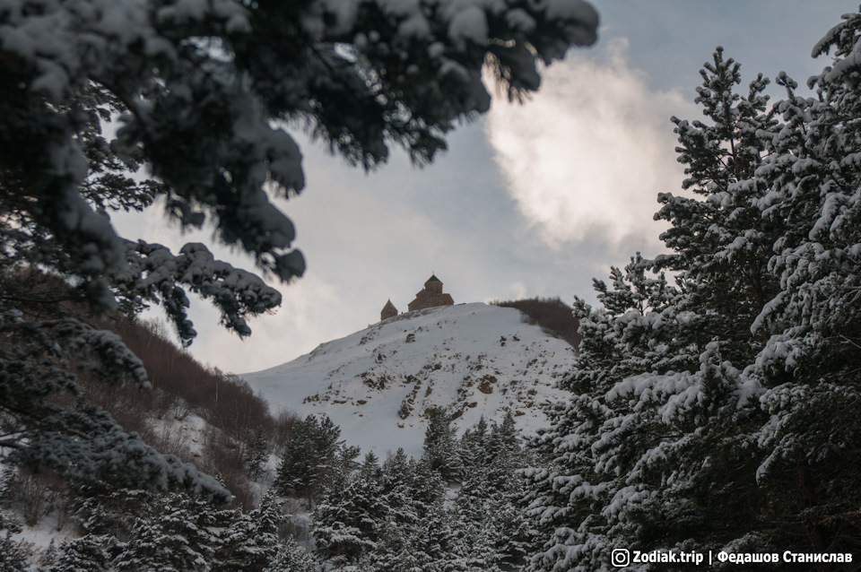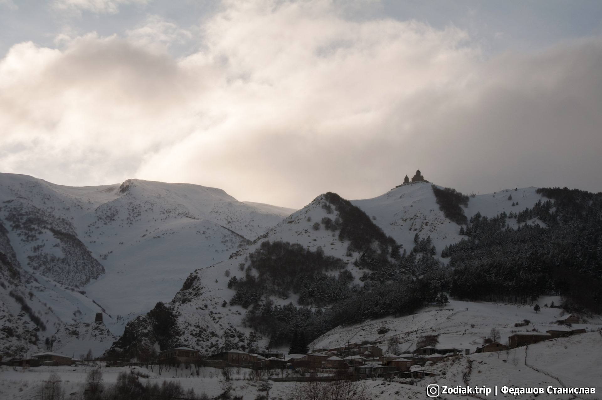 Когда планировал поездку в Гудаури, то мечтал доехать до Троицкой церкви. Кто-то из подписчиков сказал, что зимой это нереально. Но, как видите, по фотографии — вот машина, а сверху церковь.