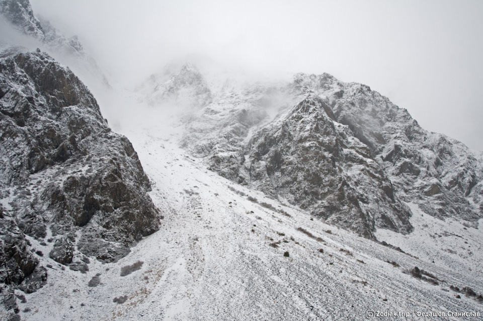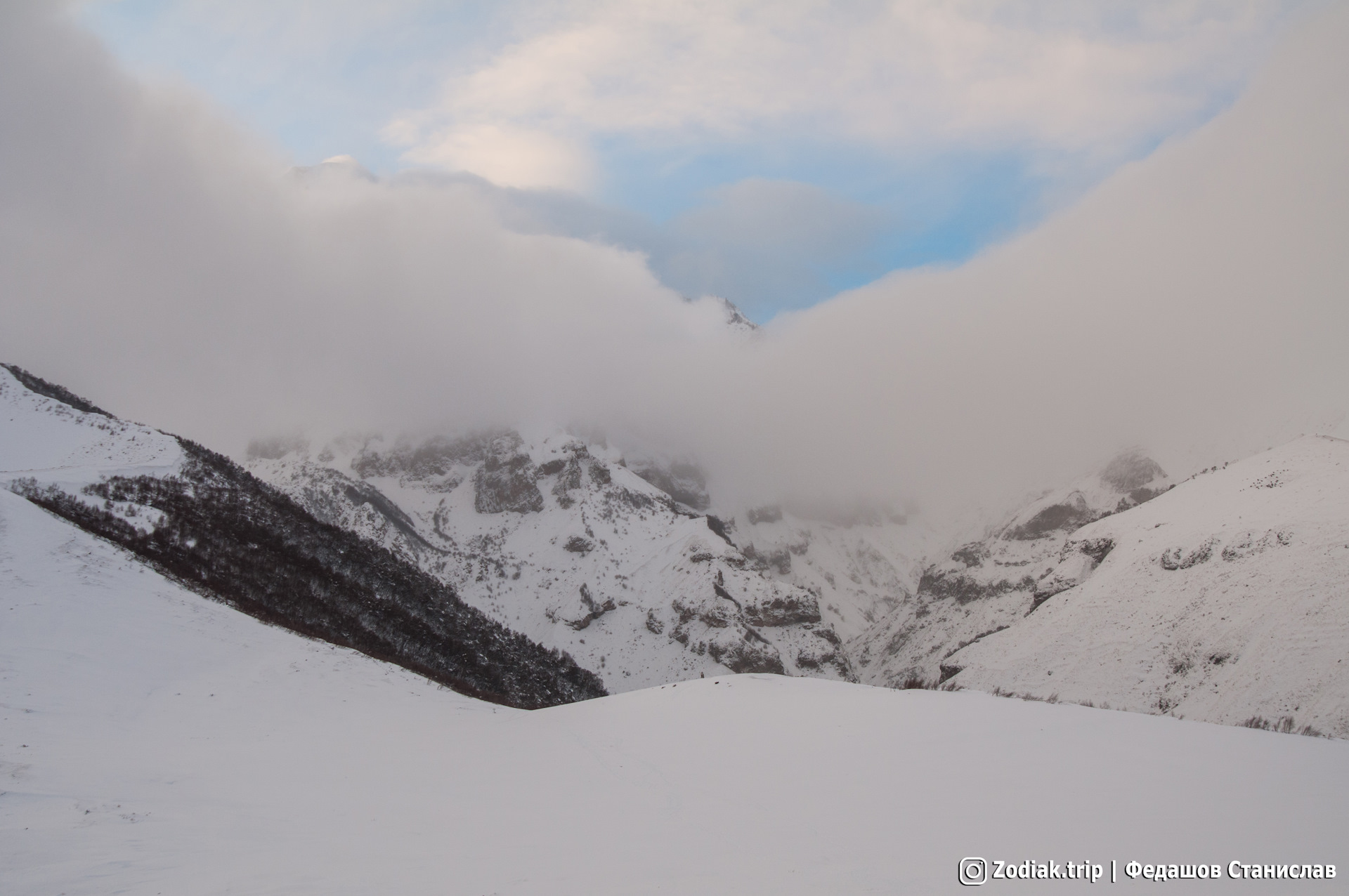 Поднявшись наверх мы не увидели ничего необычного, стало быстро темнеть. Да и густые облака и сильный снегопад все красоты скрыли от наших глаз. Было пару моментов, когда я поймал частичку горного хребта в кадре.