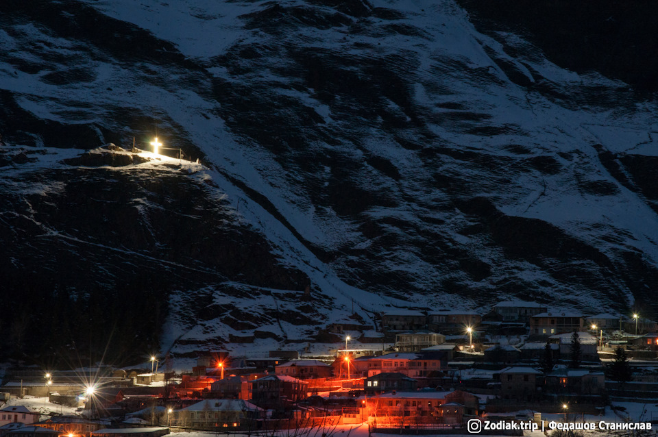 Если ехать по Грузии ночью, то практически в каждом поселении можно увидеть большой светящийся крест. Грузины очень трепетно относятся к религии и гордятся тем, что они православные. На фотографии изображена одна из грузинских деревушек недалеко от Казбеги, над которой возвышается символ православия…