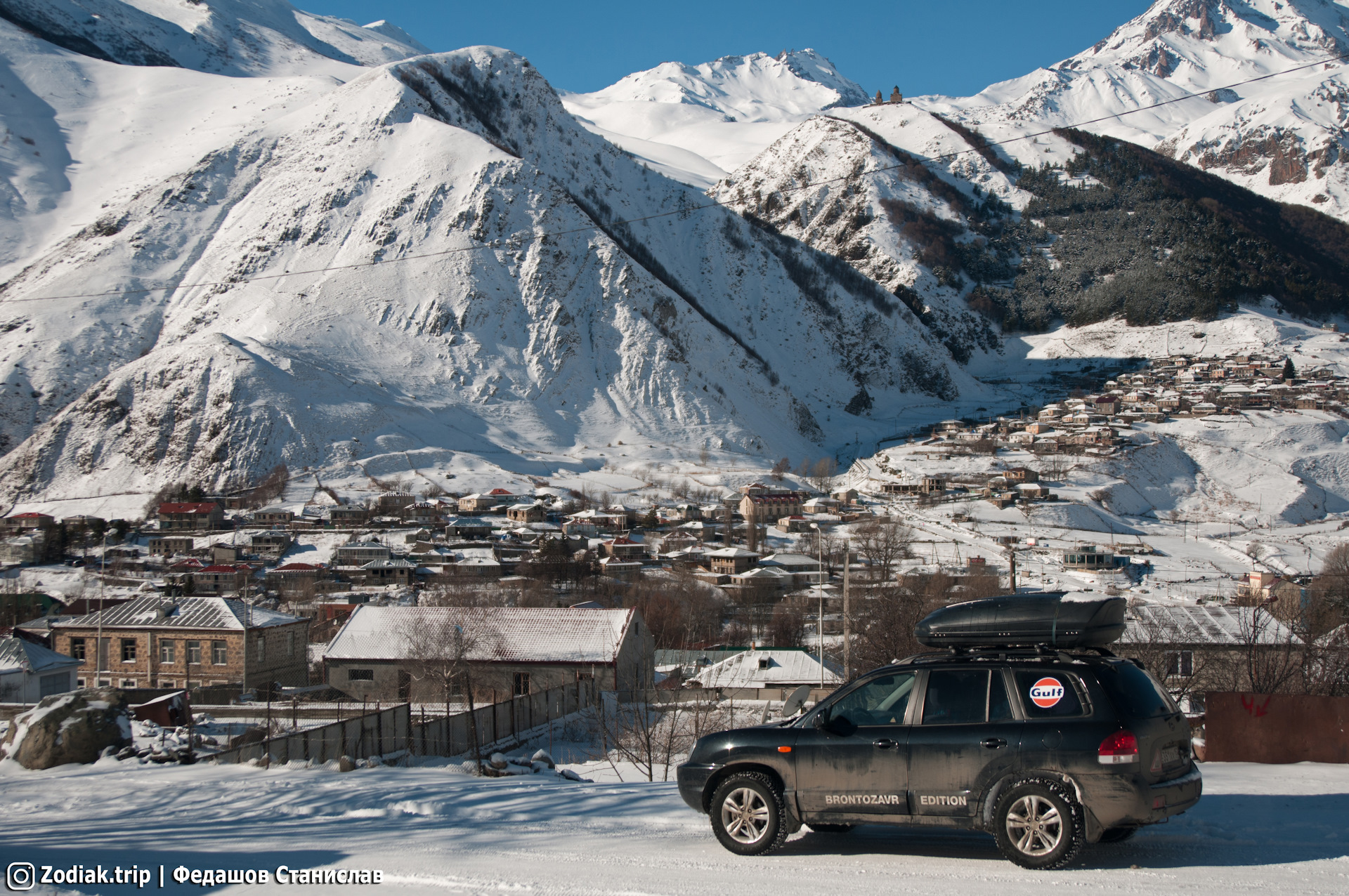 Незадолго до нашего приезда был сильный снегопад, выпало около 1 м снежного покрова. Ехали по ледяному серпантину неспешно и ни разу не пожалели, что приехали на шипованных шинах. Ехать недалеко, от границы до Степанцминды всего около 15 км. В итоге, наткнулись на пробку из-за буксующуей фуры. К Степанцминде доехали за час до наступления нового года…по крайней мере я так думал, потому что забыл перевести часы на час назад ;)