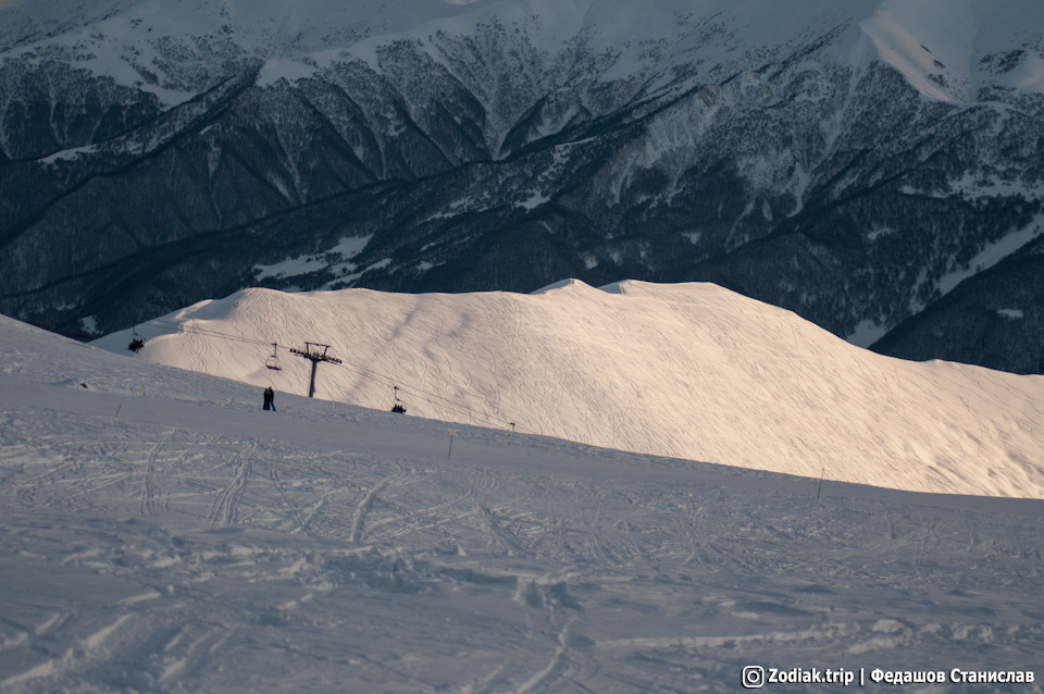 Погода настала просто шикарная. Поэтому выезжали к открытию подъемников в Гудари, чтобы успеть покататься по нераспаханному склону. Мне стало понятно, что совмещать активное катание и фотографию очень сложно. Кинул я фотоаппарат в машину и доставал его нечасто, так как катались мы с утра и до закрытия подъемников. Даже не обедали практически, насколько сильно хотели кататься. Нагрузка на ноги и на организм в целом серьезная…не до глупостей :)