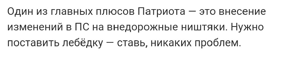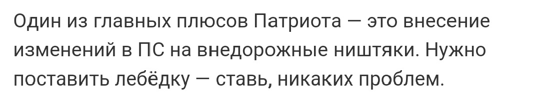 Немного не понял фразы, можете немного пояснить? "Один из главных плюсов Патриота — это внесение изменений в ПС на внедорожные ништяки. Нужно поставить лебёдку — ставь, никаких проблем."