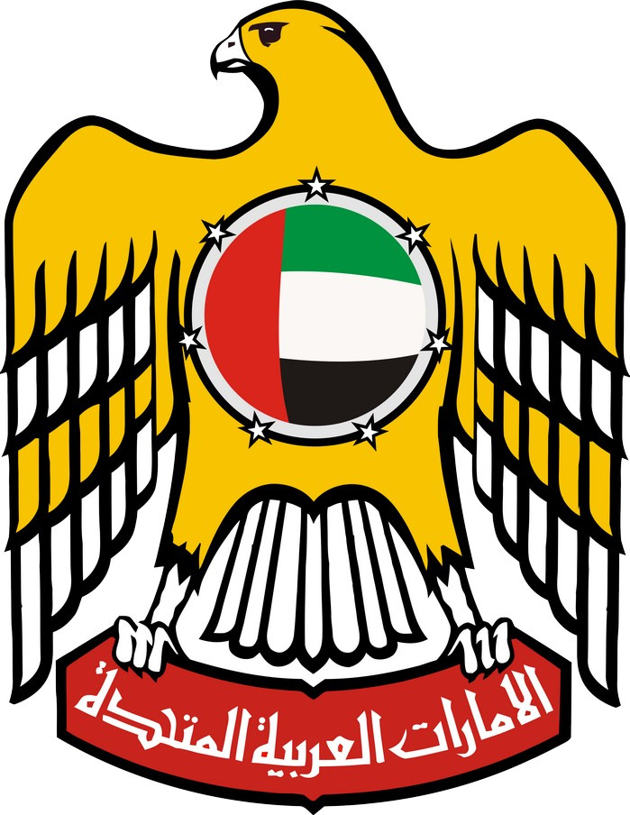 Хищная птица изображена с широко распахнутыми крыльями, головой, повернутой влево. В хвостовом оперении можно насчитать семь перьев, равных числу эмиратов, на которые делится страна. Птица окрашена в желтый (золотой) и белый (серебряный) цвета, которые соотносятся с драгоценными металлами. Желтый цвет, отвечающий в геральдике золотому, напоминает о том, что большая часть территории страны занята пустыней.