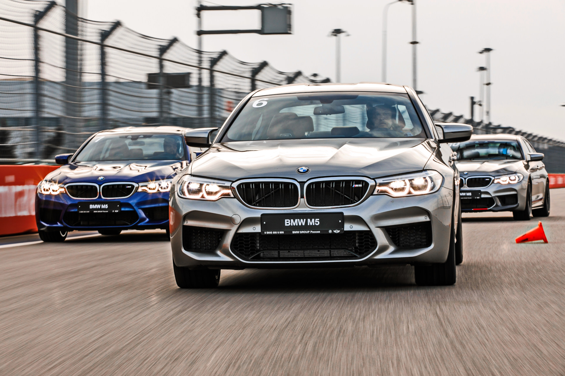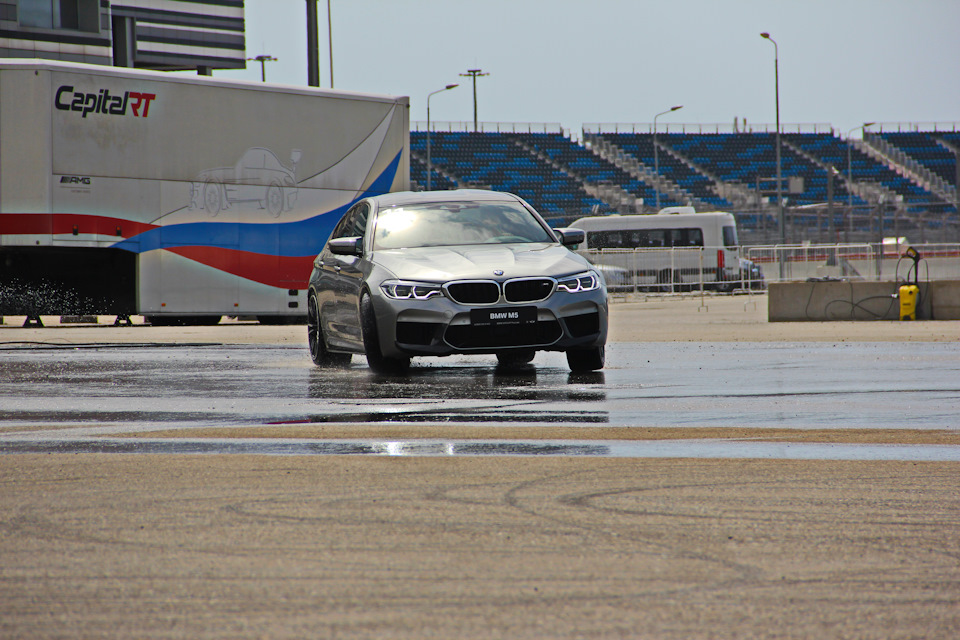 «Давайте начнем с простого- змейка, управляемый занос и наконец дрифт»- промолвил инструктор. Первое и самое «простое» испытание. После легкой разминки вокруг конусов, чтобы научиться правильно держать руль, последовал ряд упражнений на мокром асфальте, которые заставляли голову кружиться, резину гореть, а турбину свистеть от удовольствия. Основной смысл таких упражнений заключался в том, что участники должны были прочувствовать новую М5 и понять, как работают режимы «М1» и «М2», кнопки включения которых находятся на рулевом колесе и выделены красным цветом. Каждый из режимов можно настраивать под себя через меню iDrive. В нашем случае режим «М1» отключает полный привод и систему ESP, а «М2» только систему ESP, но при этом оба режима делают двигатель и настройки коробки злее, переводя рулевое управление и подвеску в спортивный режим.
