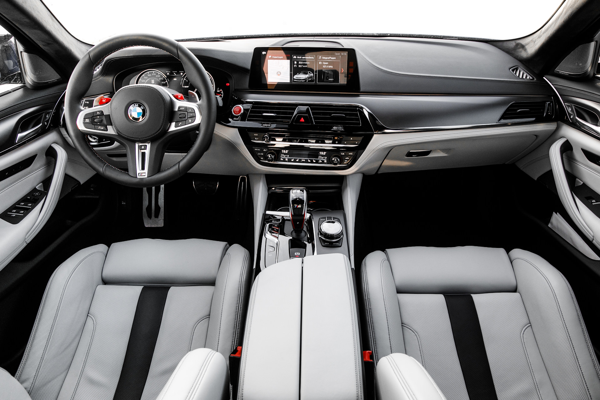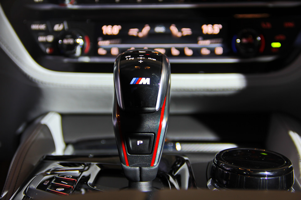 Вот только сейчас пришло время подробнее поговорить о виновнице тожества. Пятерка серии F90 мне уже знакома, поэтому, сев за руль, я почувствовал себя как дома. Все те же отличные материалы с четкими прострочками, виртуальная панель и огромный дисплей мультимедиа установки, максимальный уровень проработки мелочей и эргономики. Проекция с отличным разрешением наделена неплохой цветовой гаммой и индивидуальной графикой. Но кресла конечно шокируют удобством и всесторонней поддержкой. Красная кнопка старт/стоп так и просит запустить мотор, после чего ремень безопасности нежно подтягивается, а боковая поддержка автоматически напоминает, что ты находишься не совсем в простом автомобиле. Рычаг КПП полностью переработан и наконец в «М»-ке появилась кнопка «паркинг».