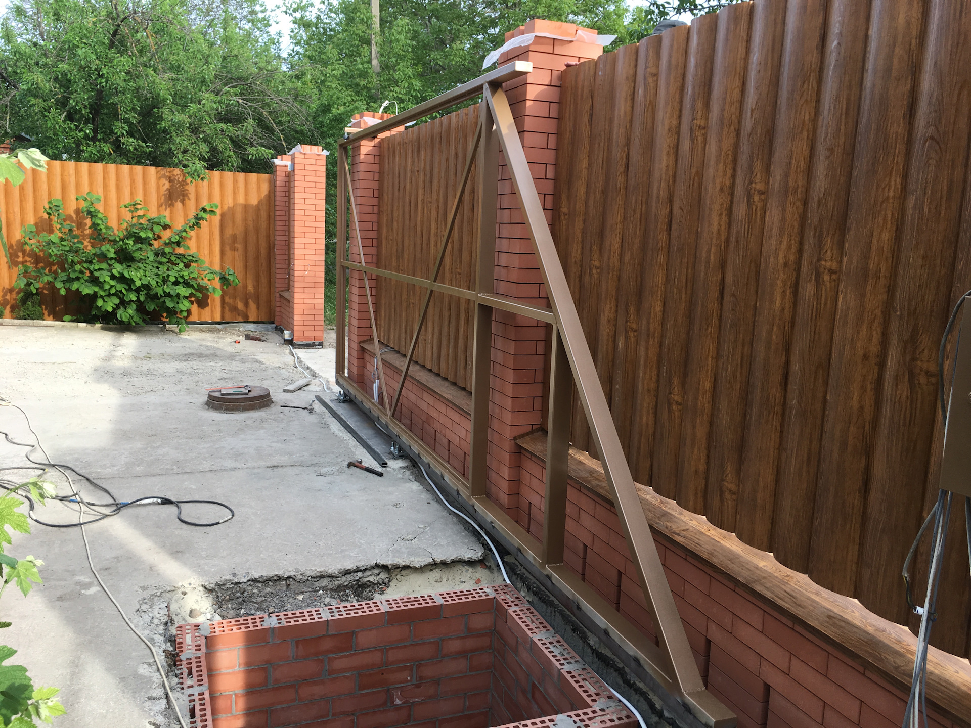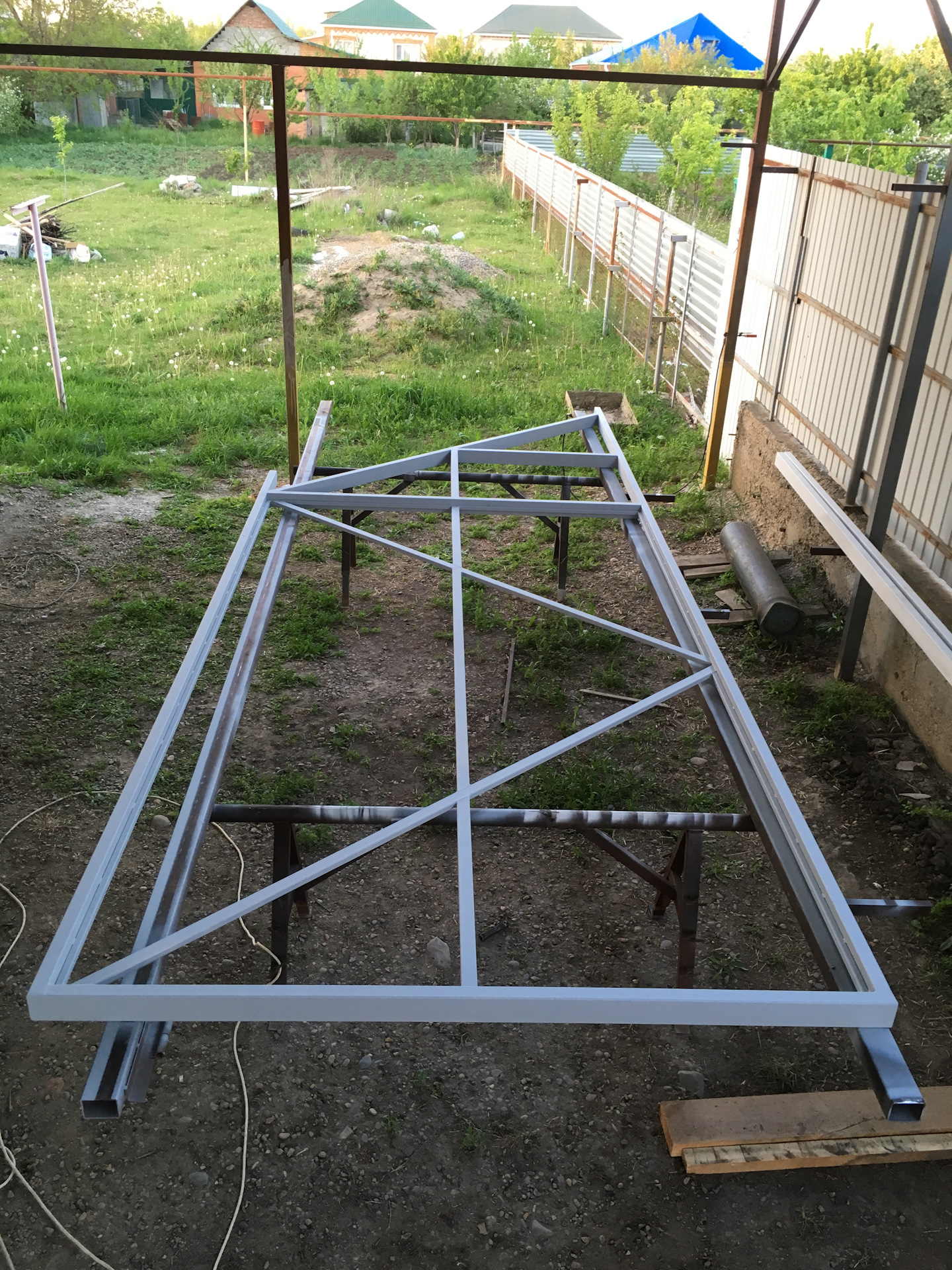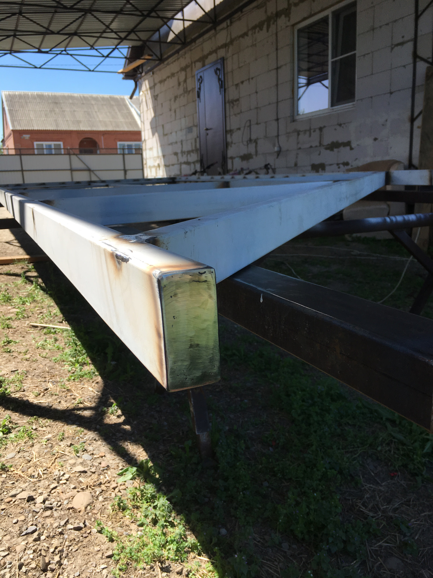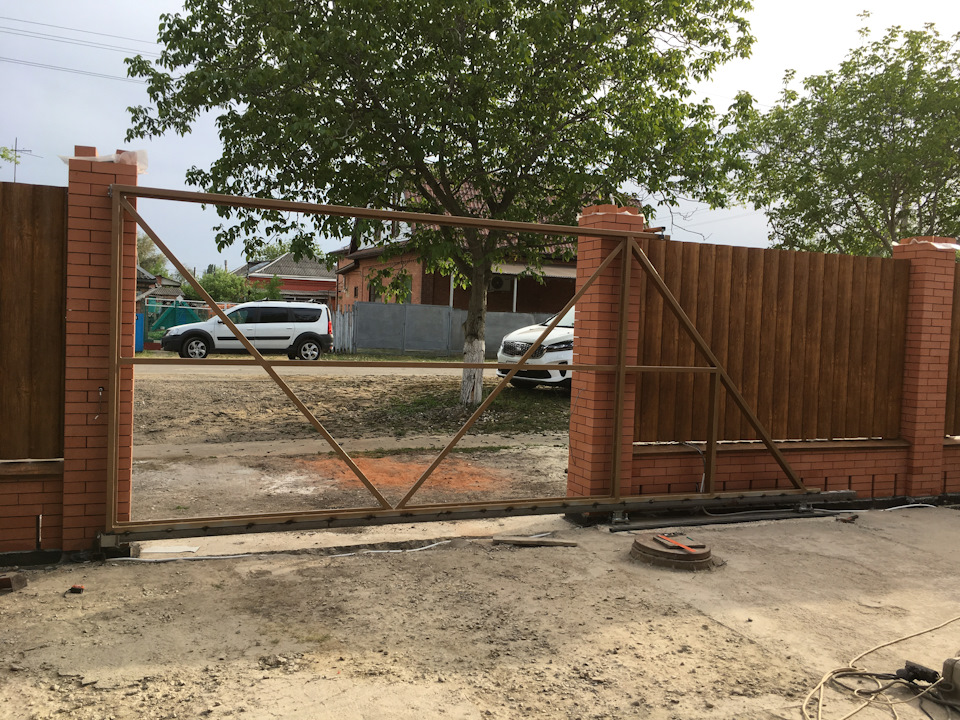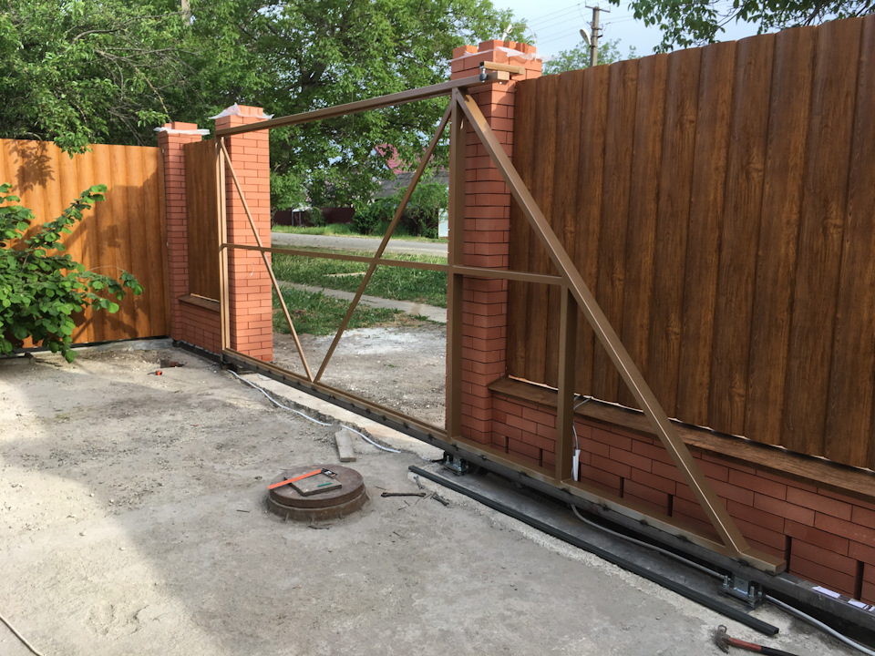 Когда все выставлено везем ворота. Ставим на балку и привариваем. Важно! Балка должна стоять в ловушке. Я еще подлаживаю между балкой и ловушкой пластинку жести, не более 1-1,5 мм.
