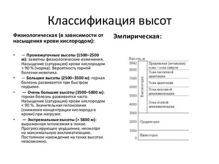 В чем же заключается основная опасность при восхождении на большие высоты для неподготовленного человека? Не считая рисков, связанных с срывом, падением в трещины, обрушением карнизов, иными травмами, все-же основной риск — горная болезнь. При этом тяжесть и последствия горной болезни начинают проявляться уже после 3 500м и стремительно увеличиваться с набором высоты. По — медицинским показателям, большинство людей способны за 21 день полностью адаптироваться (акклиматизироваться) к высоте в 5 100м. Это предельная высота, на которой после полной акклиматизации возможно восстановление организма, а также физические показатели человека будут полностью соответствовать показателям на равнине. На высотах от ~5 100м до ~ 8 000м невозможна полная акклиматизация, организм медленно теряет свои силы и длительное нахождение на таких высотах приводит к постепенному угасанию здоровья. Высоты же сверх 8 000м — называют "летальной зоной", нахождение больше 48ч без кислорода на таких высотах приводит к смерти.