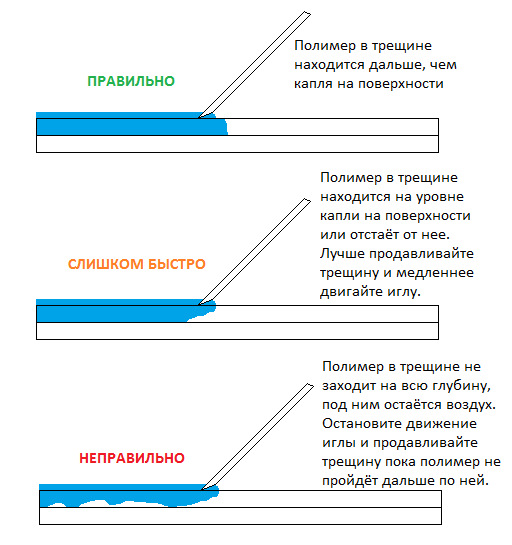 Если трещина вертикальная — желательно двигаться снизу вверх (чтобы стекающая капля не запечатала воздух в трещине). Но если у вас трещина дугой, то двигаясь от одного края к другому вы на каком-то этапе будете вынуждены двигаться сверху вниз — тогда убирайте подтеки полимера салфеткой, и аккуратно его дозируйте.
