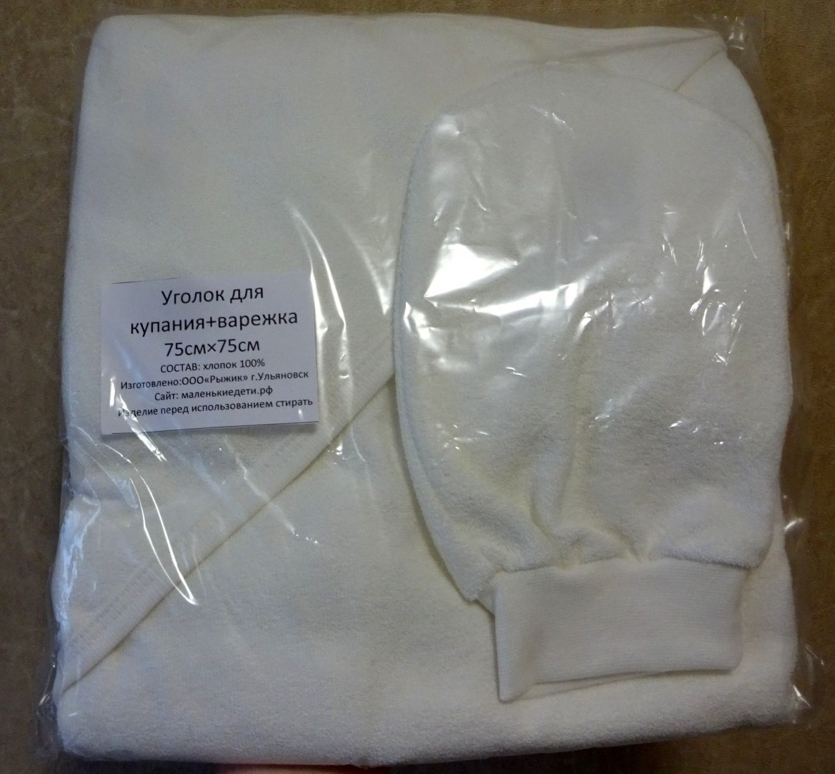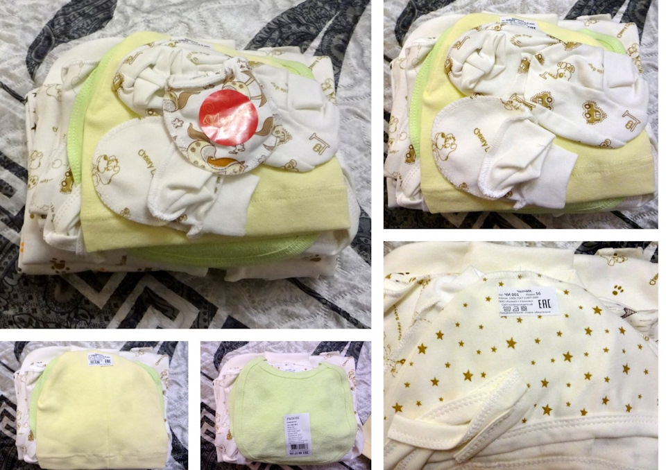 — ползунки, боди с коротким рукавом, комбинезон-слип, боди с длинным рукавом, шапочка с завязками, шапочка без завязок на шесть-девять месяцев, слюнявчик, варежки-царапки и пинетки. Одежда российского производства, фирма «Рыжик». Состав — 100%-ный хлопок; цвета приятные, с веселым рисунком. фирмы "Рыжик" (г. Ульяновск) 3 размеров 52-й, 62-й и 68-й.