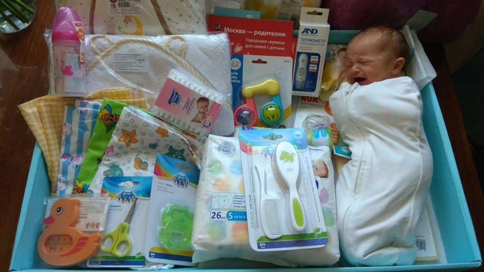В целом очень довольны подарком. Собрано действительно то что нужно, то что в суматохе можно забыть или точно забудет молодой отец бегая по магазинам один с телефоном в руках. Коробку вручают при выпеске. Сама коробка большая и полезна не только содержимым, но и формой — наш пупс до сих пор отлично в ней спит =))