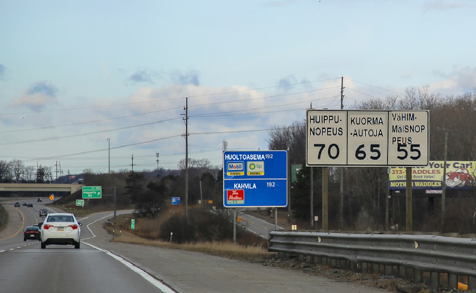Там ограничения скорости — максималка для всех, максималка для грузовиков и минималка. Я, чисто для прикола, перевёл это на финский :-)