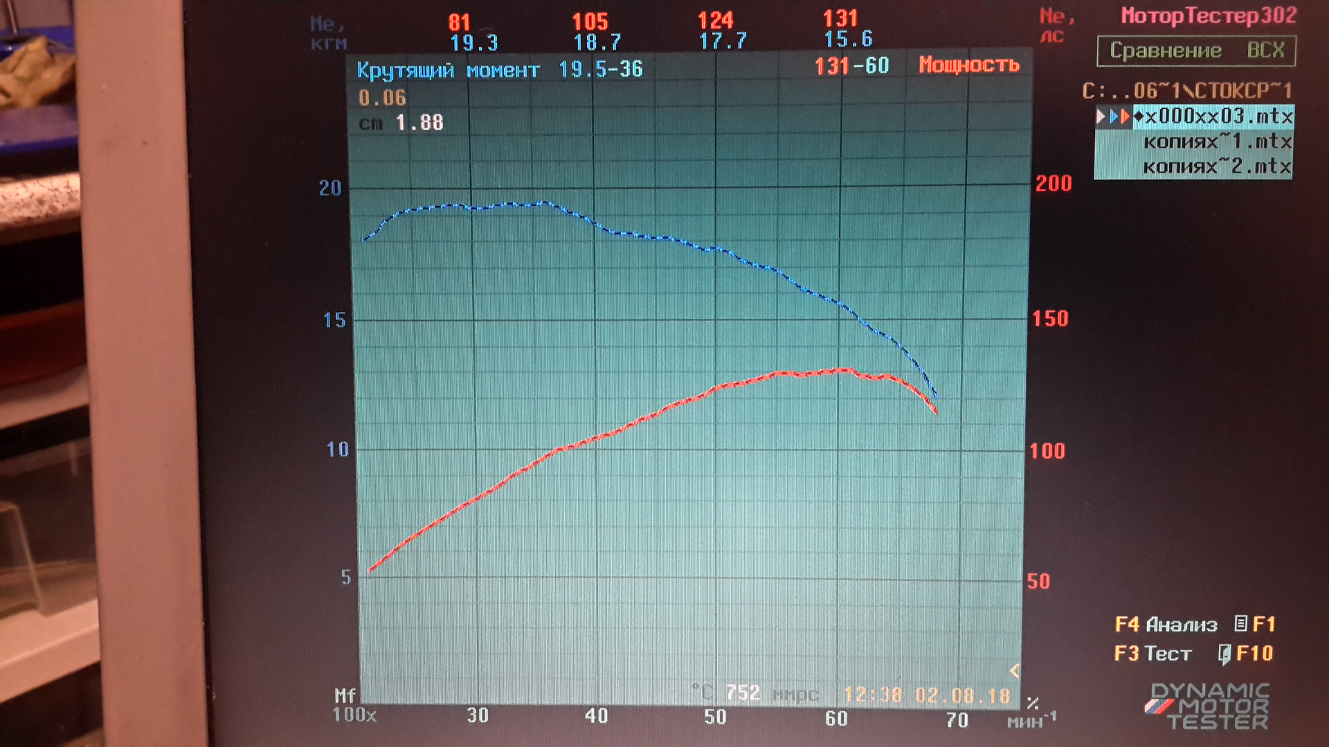 Мотор до доработки имел следующие показатели, момент 19,5 кг*м при 3500 об и мощность 110 лс при 4500 об — заводские данные. Замер ВСХ до разборки, показал больше мощности 131 лс при 6000 об, влияние прямоточный выхлопной системы .