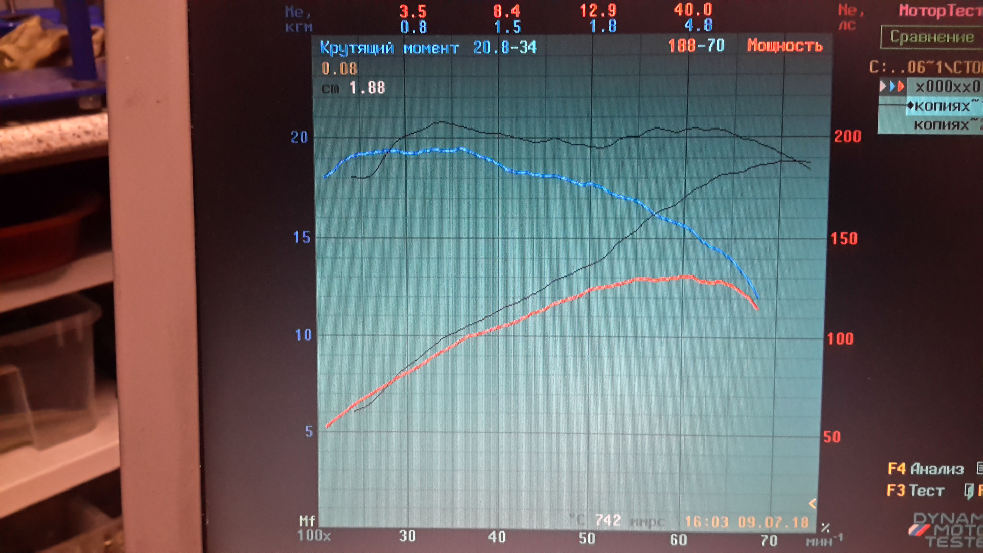 После доработки в пределах разрешенных изменений по тех.требованиям, и настройки, мотор показал момент 20,8 кг*м при 3400 об, а мощность 188 лс при 7000 об.