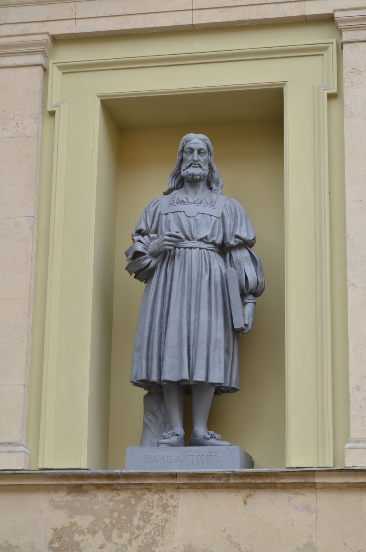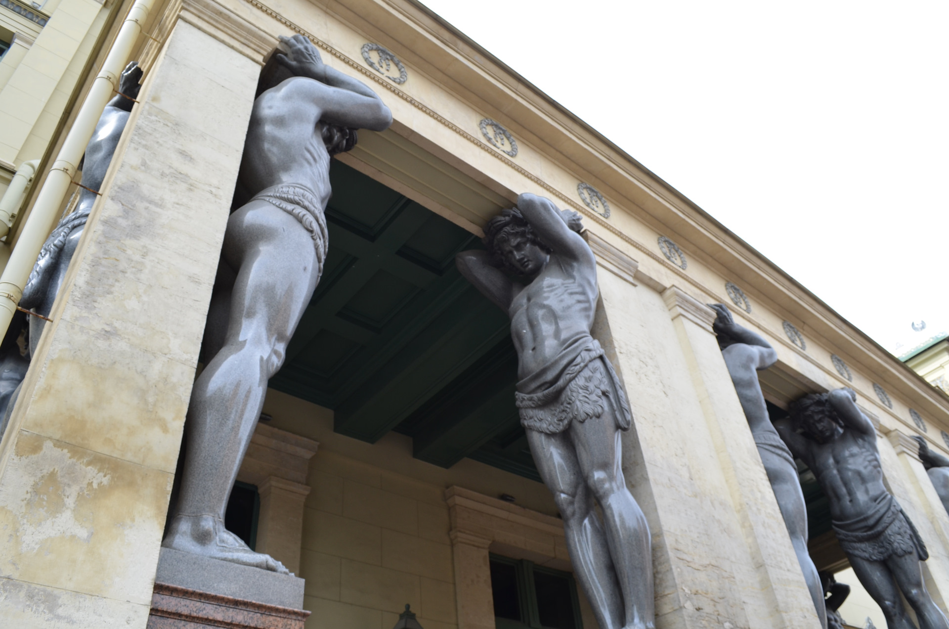 Фасад здания украсили эмблемы искусств и статуи знаменитых художников. Вход в "жилище муз" охраняют атланты: десять гранитных статуи, поддерживающих своды портика.