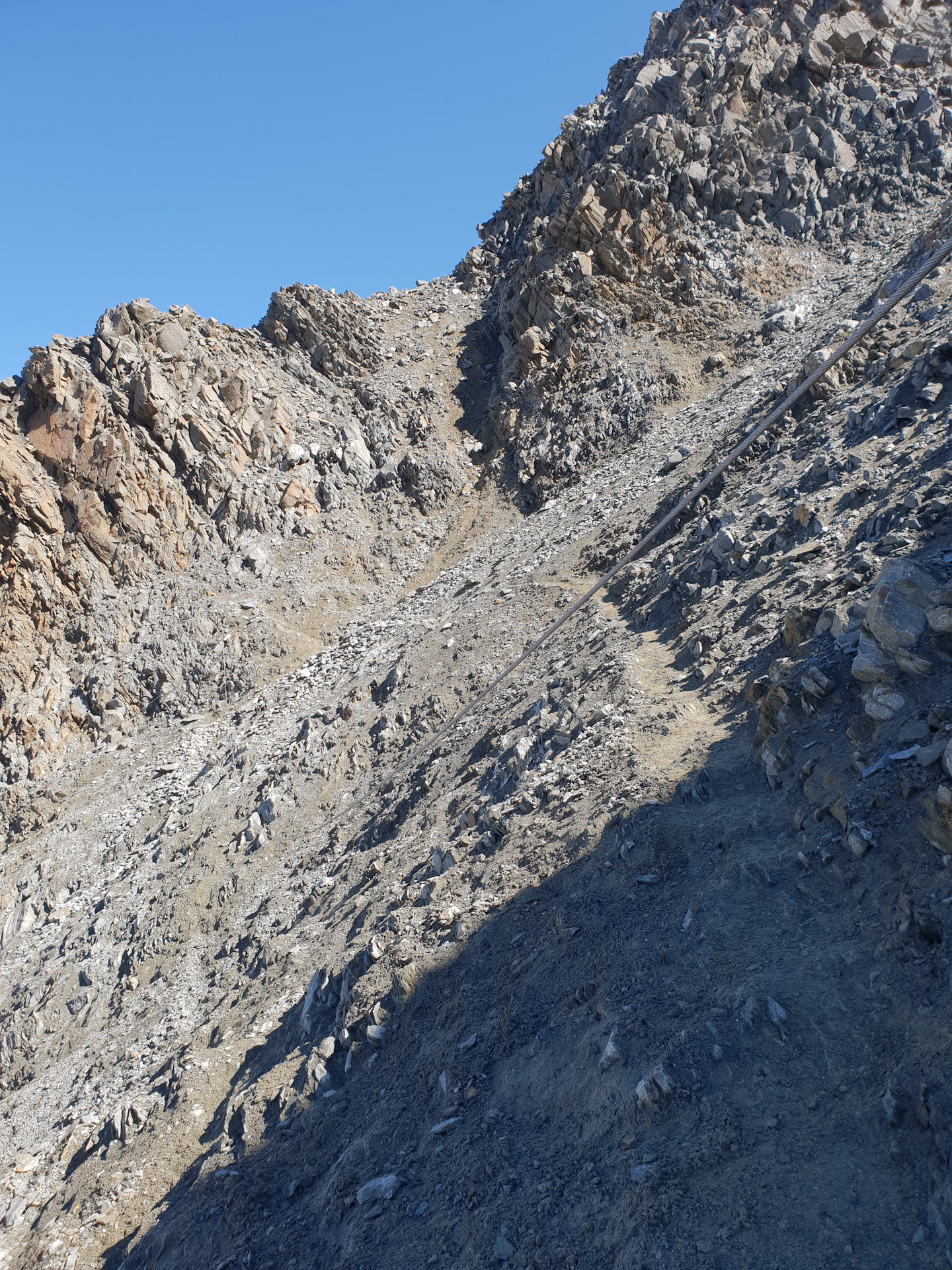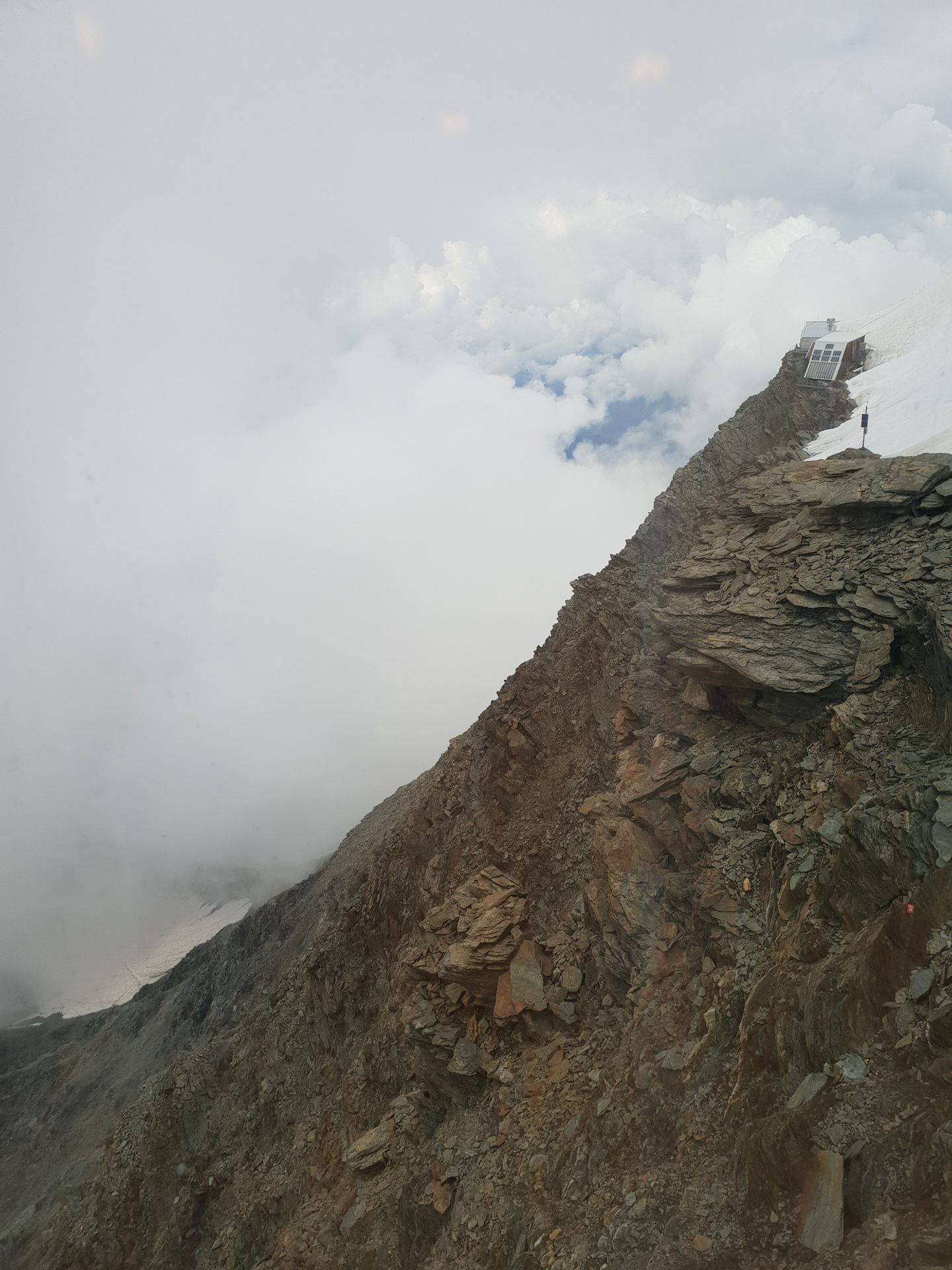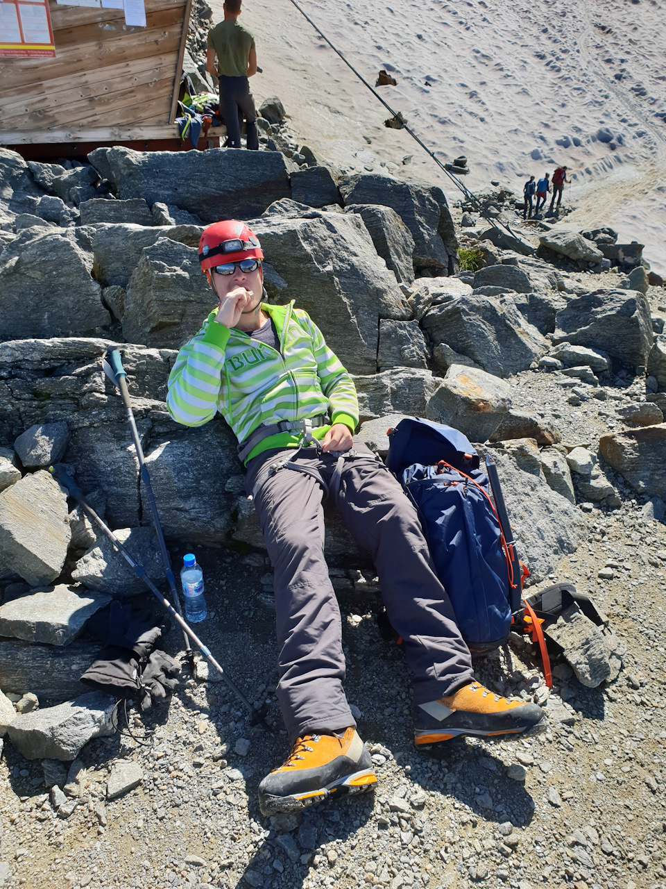 Впереди самая интересная часть подъёма – скалы до хижины Гюте, подъем по вертикали порядка 700м после кулуара. Ранее на Эльбрусе, Килиманджаро и на Казбеке я не ходил по таким скалам, это было интересно и немного страшно. Но нужно понимать, что по ним прошли сотни тысяч таких же неопытных туристов как я и чуть меньше опытных альпинистов как мой гид, поэтому тропа сделана таким образом, что всегда есть место для левой ноги, далее правой ноги и места зацепиться руками. Если бы этого не было, поток туристов был бы значительно ниже, тк а) это становится более опасно и б) скорость прохождения таких участков значительно ниже, а тут почти «автобан». Так что плавными движениями без рывков подтягиваем себя с камня на камень. Иногда идем одновременно, иногда последовательно – об этом гид заранее сообщает и нужно лишь выполнять его команды. При этом он страхует нас заводя веревку за камни или цепляясь карабином за протянутые металлические тросы. Так что для неопытного туриста вроде меня, да и для многих других, этот участок лишь кажется страшным и тяжелым, на деле это просто крутой трекинг.