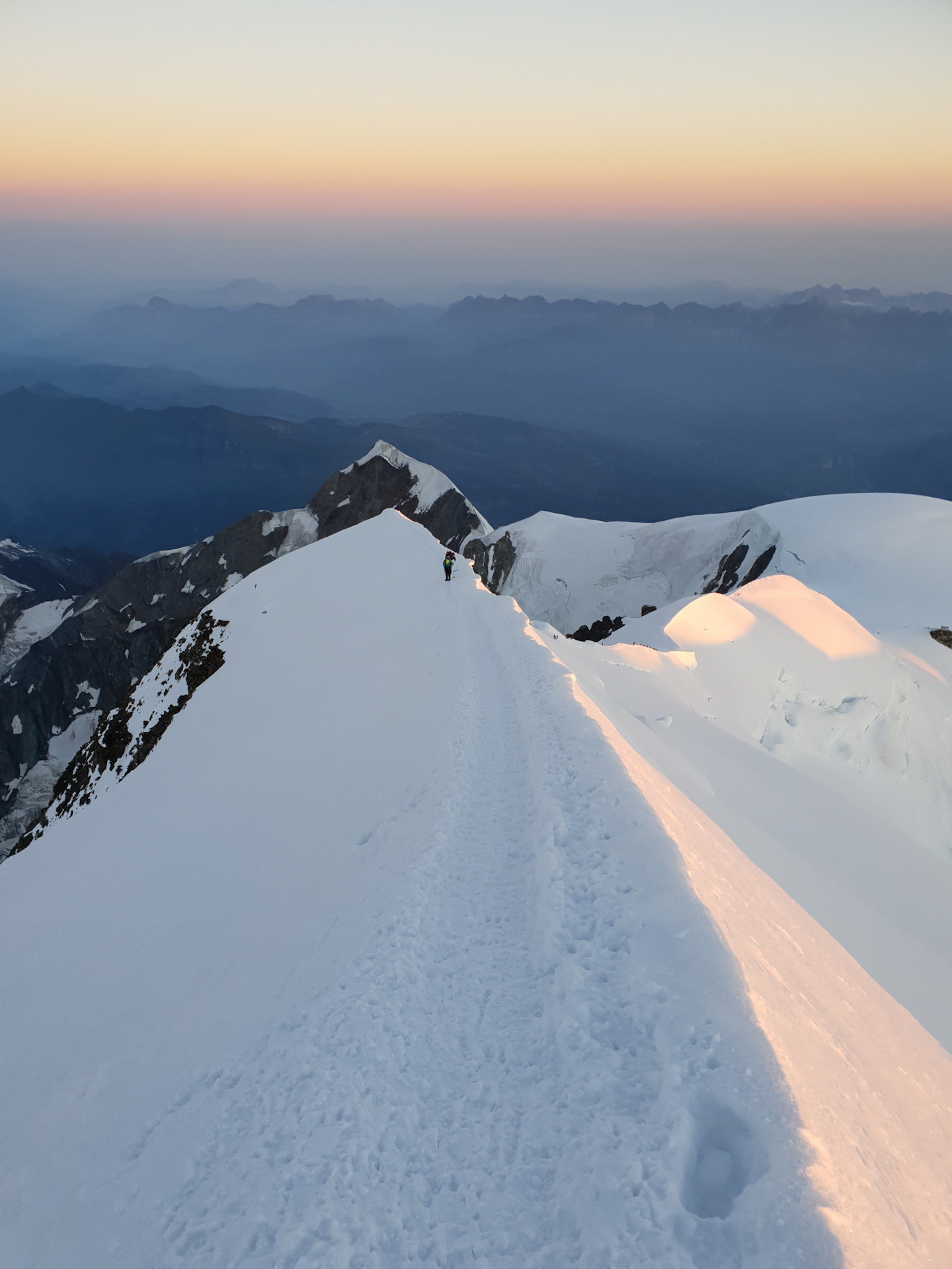 Температура около минус 7-10 градусов, но не холодно. Радостно! Вглядываюсь в горизонт – вот Маттерхорн, с другой стороны видно как Монблан отбрасывает огромную треугольную тень.