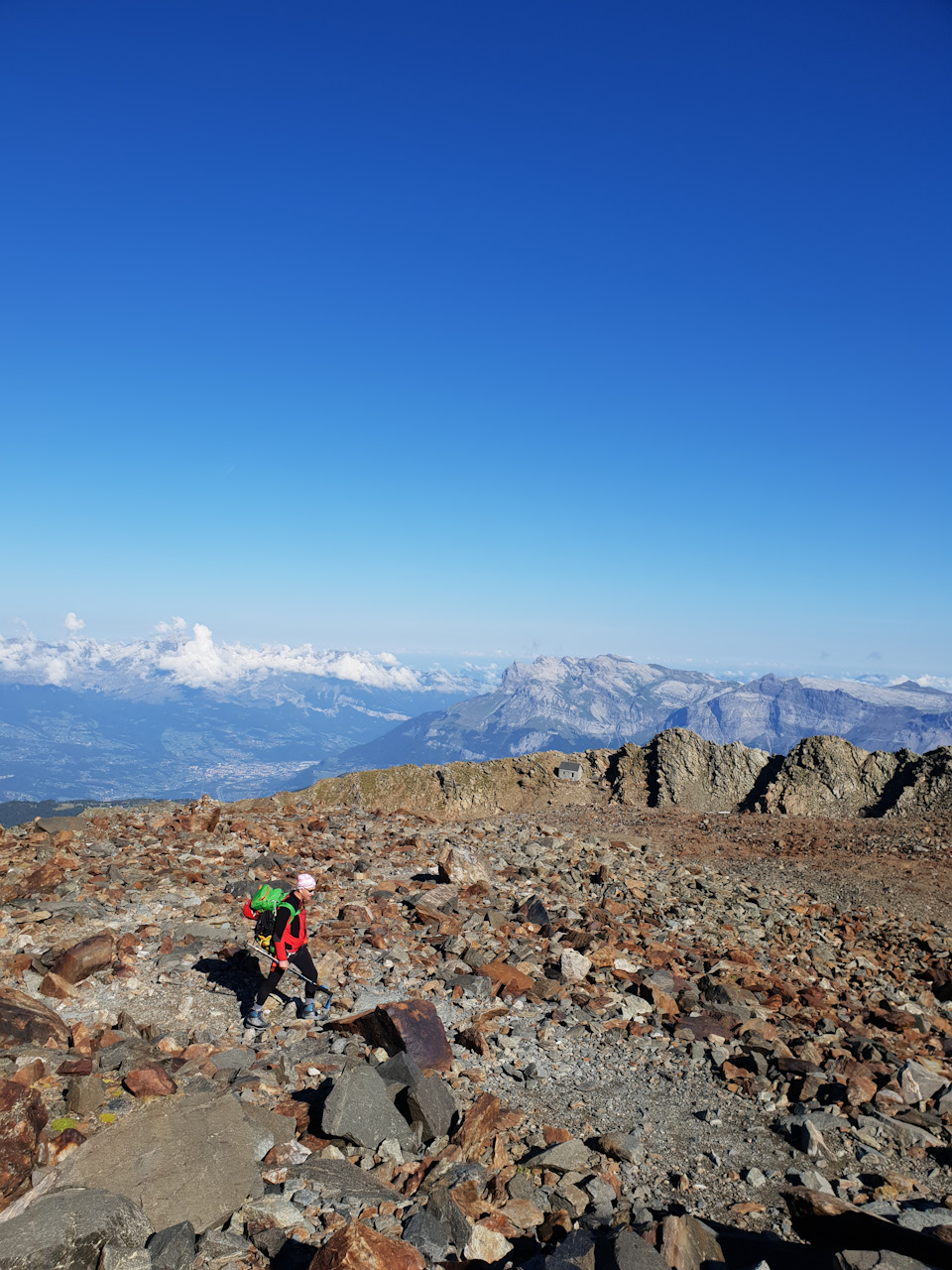 На подъёме в основном тишина, ветра нет, погода шикарная. Утром над горами разносится шум прогулочных самолетов и грузовых вертолетов, доставляющих провизию в хижину. Почти в конце подъема слышим страшный грохот – в кулуаре рядом с нами сорвались несколько тонн камней и собрали большую лавину. Вроде никто не пострадал, выглядело очень внушительно.
