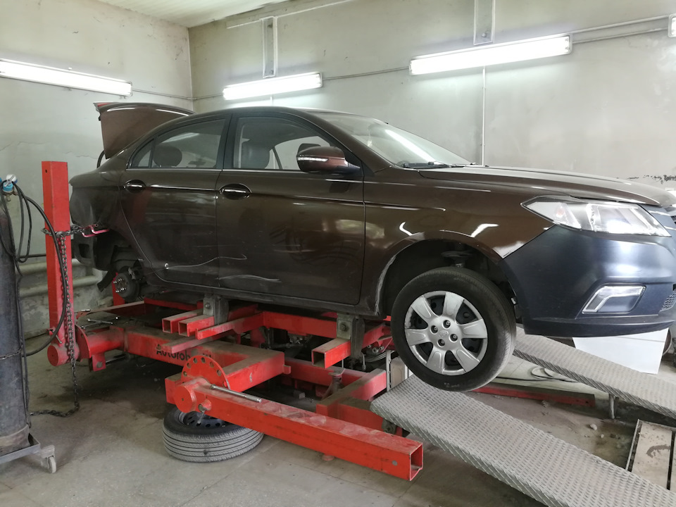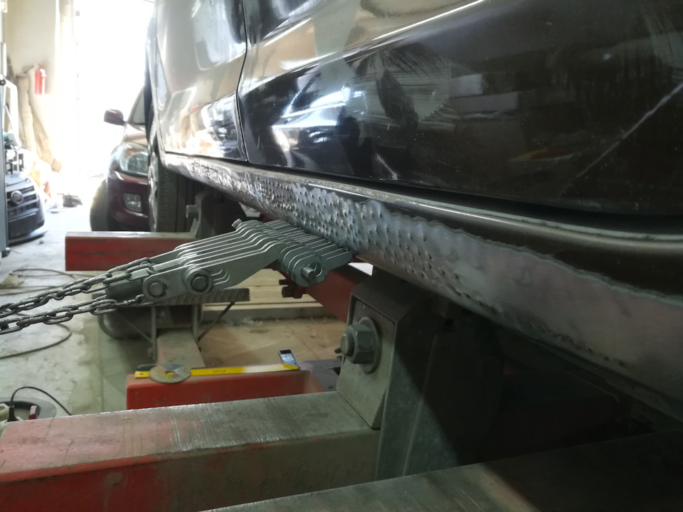 Загоняю авто на стапель, теперь работаю на кузовной системе Авторобот. И начитаю растягивать крыло и арку колеса.