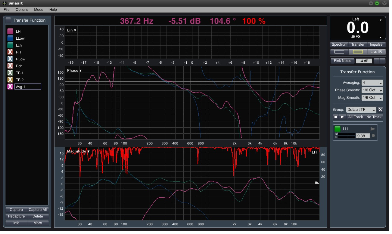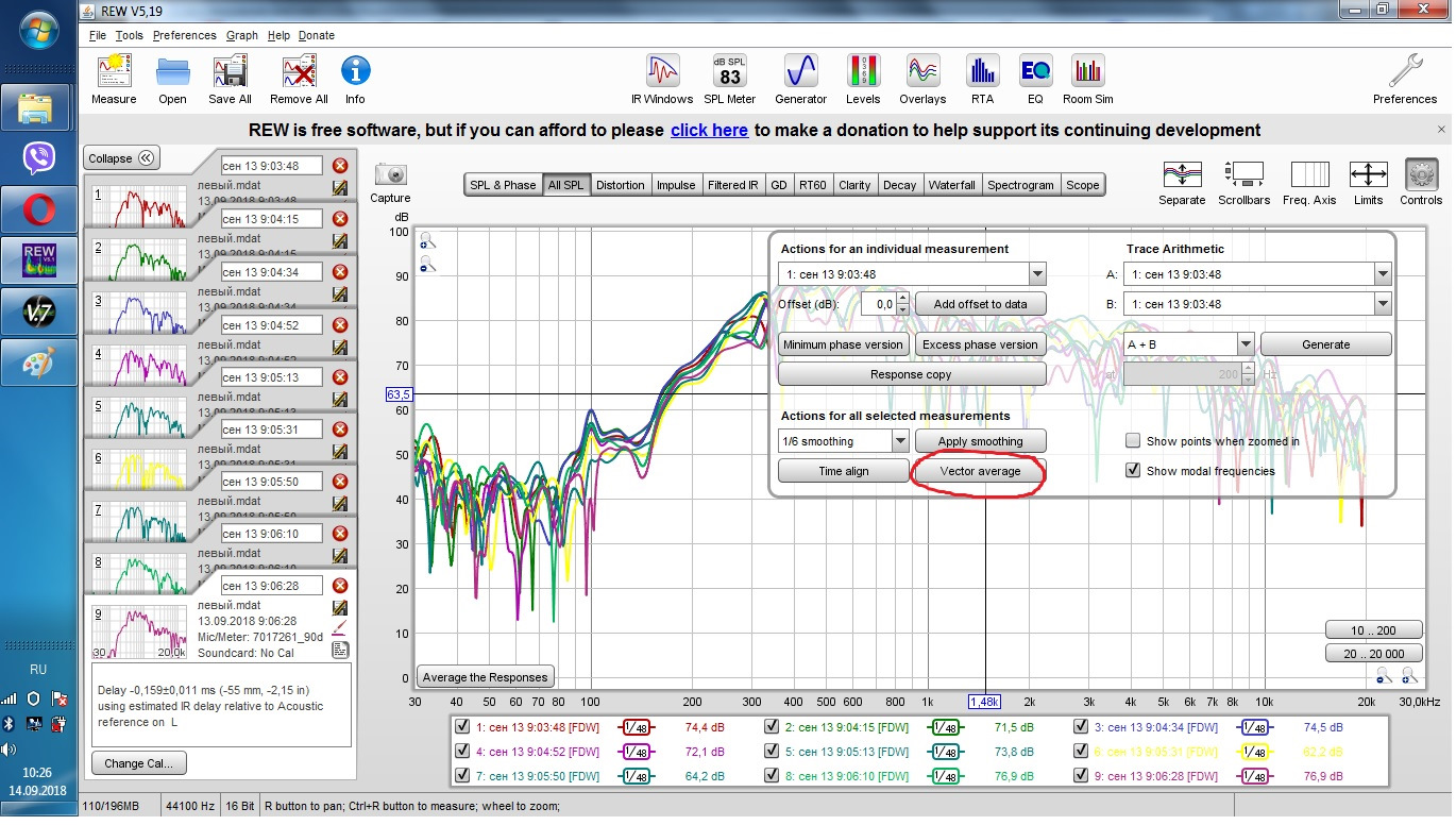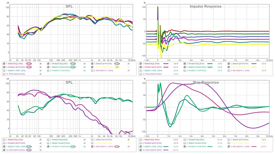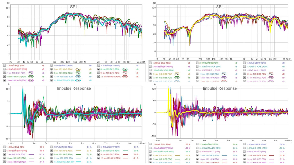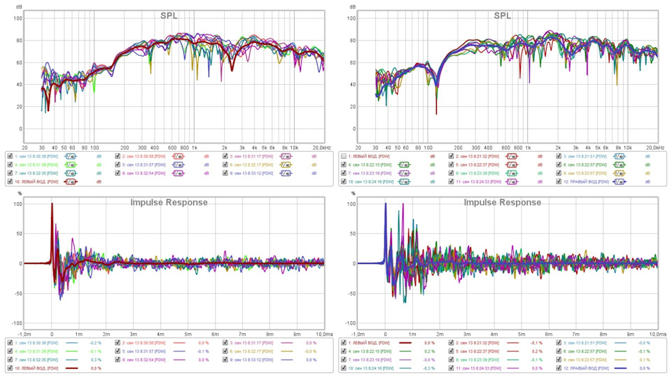 Измерения проводились на водительском месте, направление микрофона вверх. Так надо для уменьшения направленности (придумал не сам, есть методичка специальная) Замеры проводились по 9 точкам. Центр и по углам параллелепипеда, примерно со стороной 25см. Сглаживание применялось FDW (это когда размер окна не зависит от частоты).
